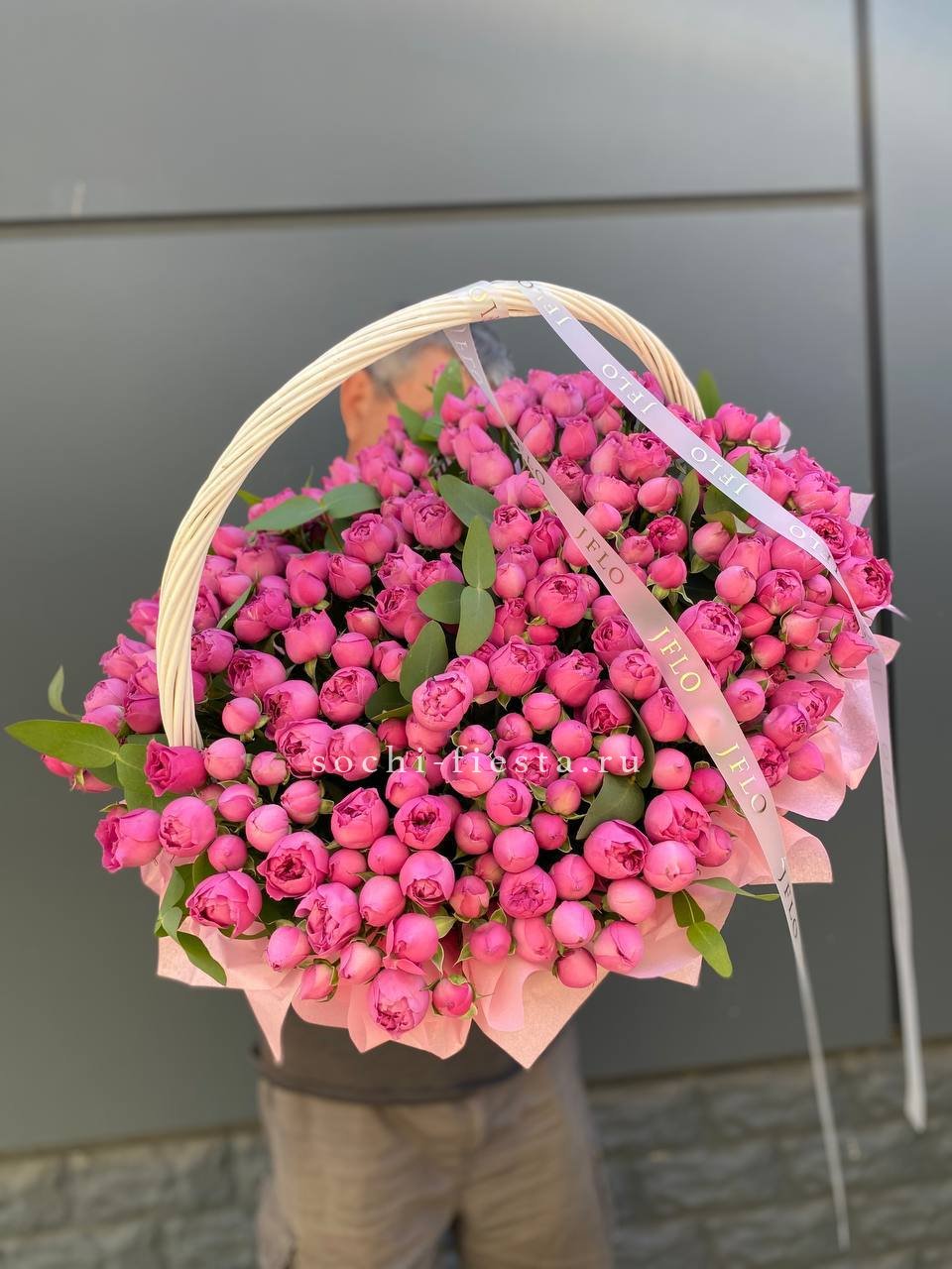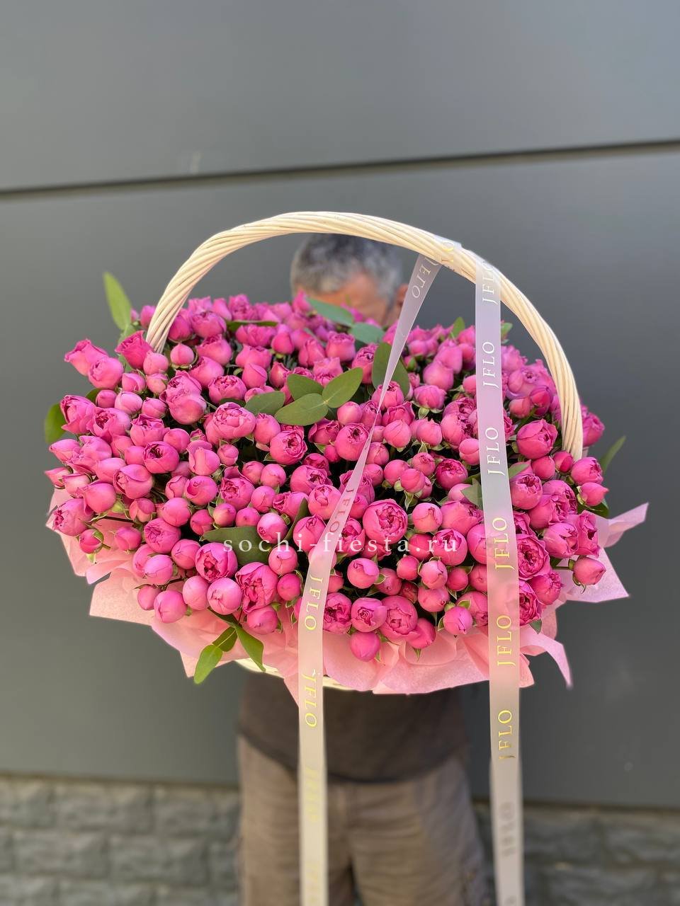 роза розовая (оттенки от нежно-розового до фуксии по наличию) французские - 25шт, эвкалипт, корзина.