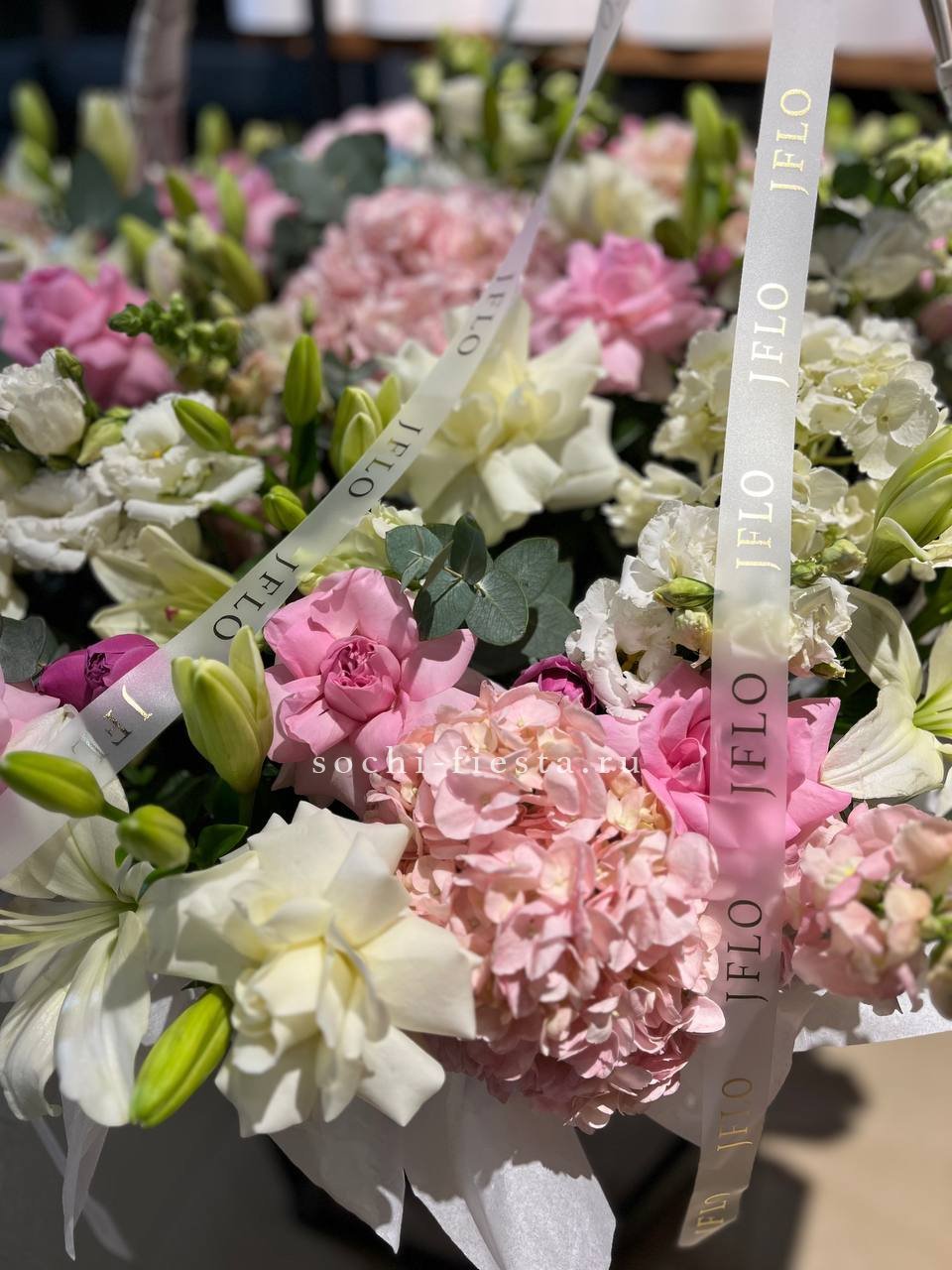 Масштабная корзина объединяет лилии, гортензии, антиринум, розы и эустому в единую объёмную композицию. Высота и насыщенность каждого слоя создают впечатление цветочного изобилия.