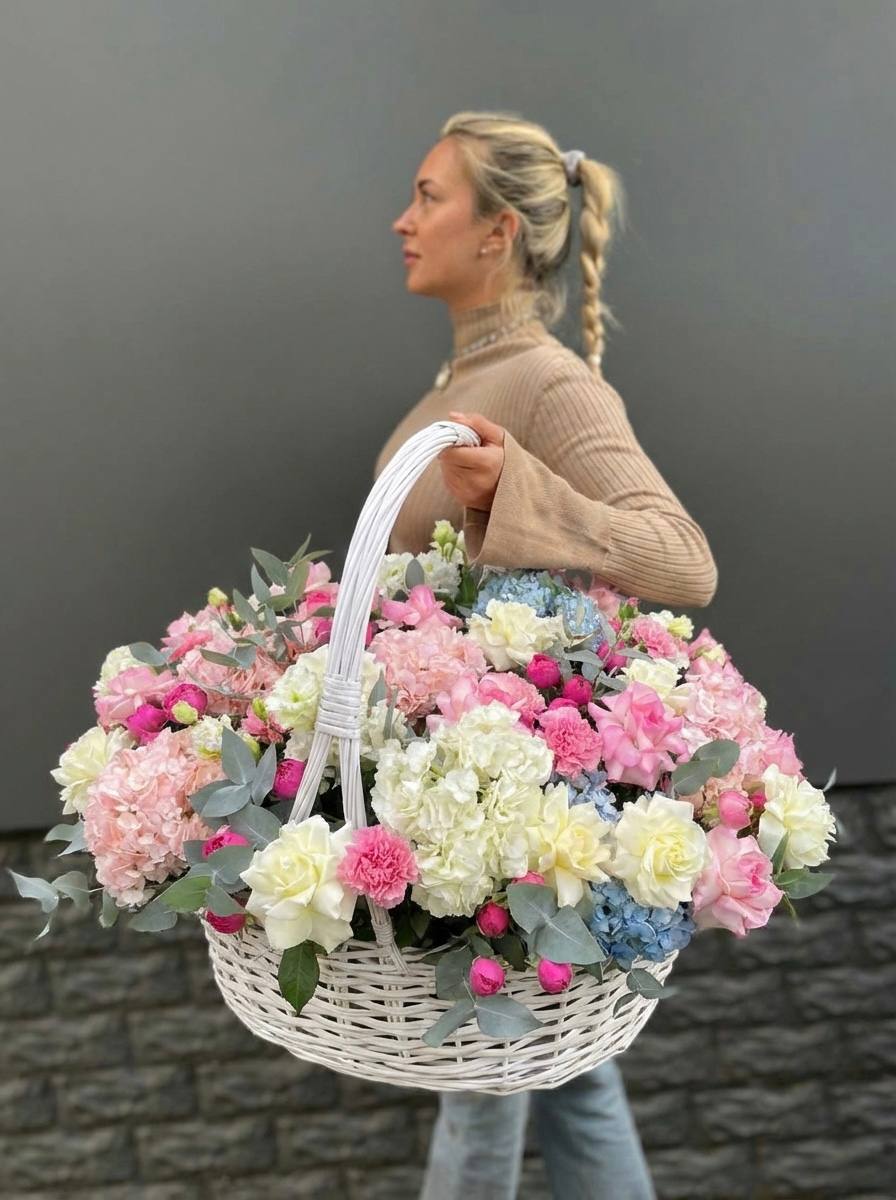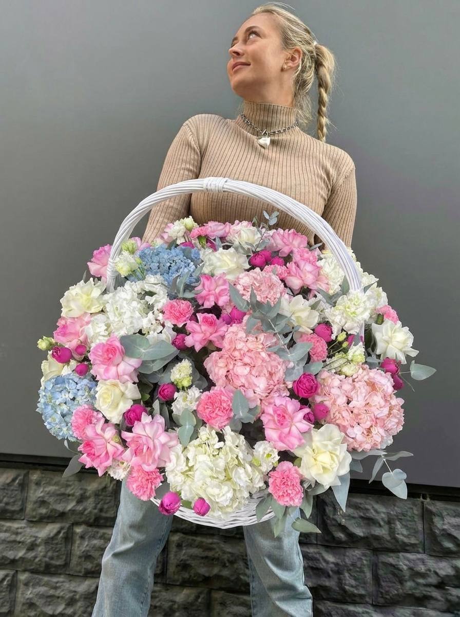 Диантусы создают воздушную текстуру, розы добавляют объем, а эустома раскрывается мягкими волнами. Композиция собрана в корзине и держит форму без лишних деталей.