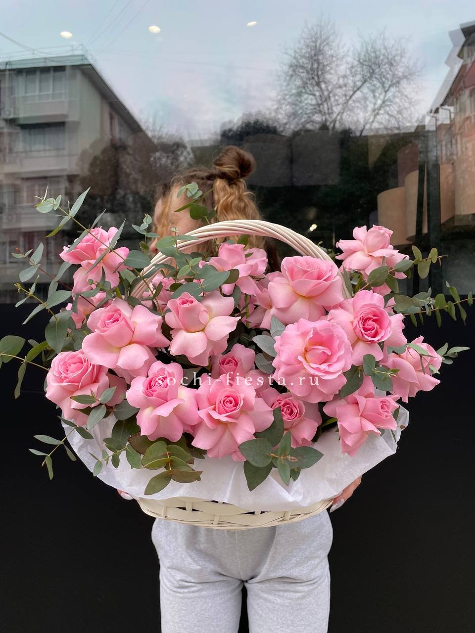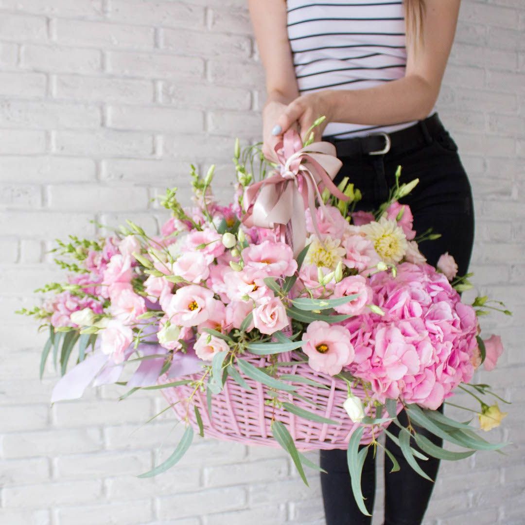 Воздушные соцветия эустомы собраны в округлую композицию с мягким переходом пастельных тонов. Светлая корзина создает легкую базу для объемной цветочной шапки.