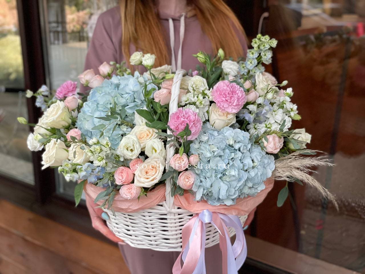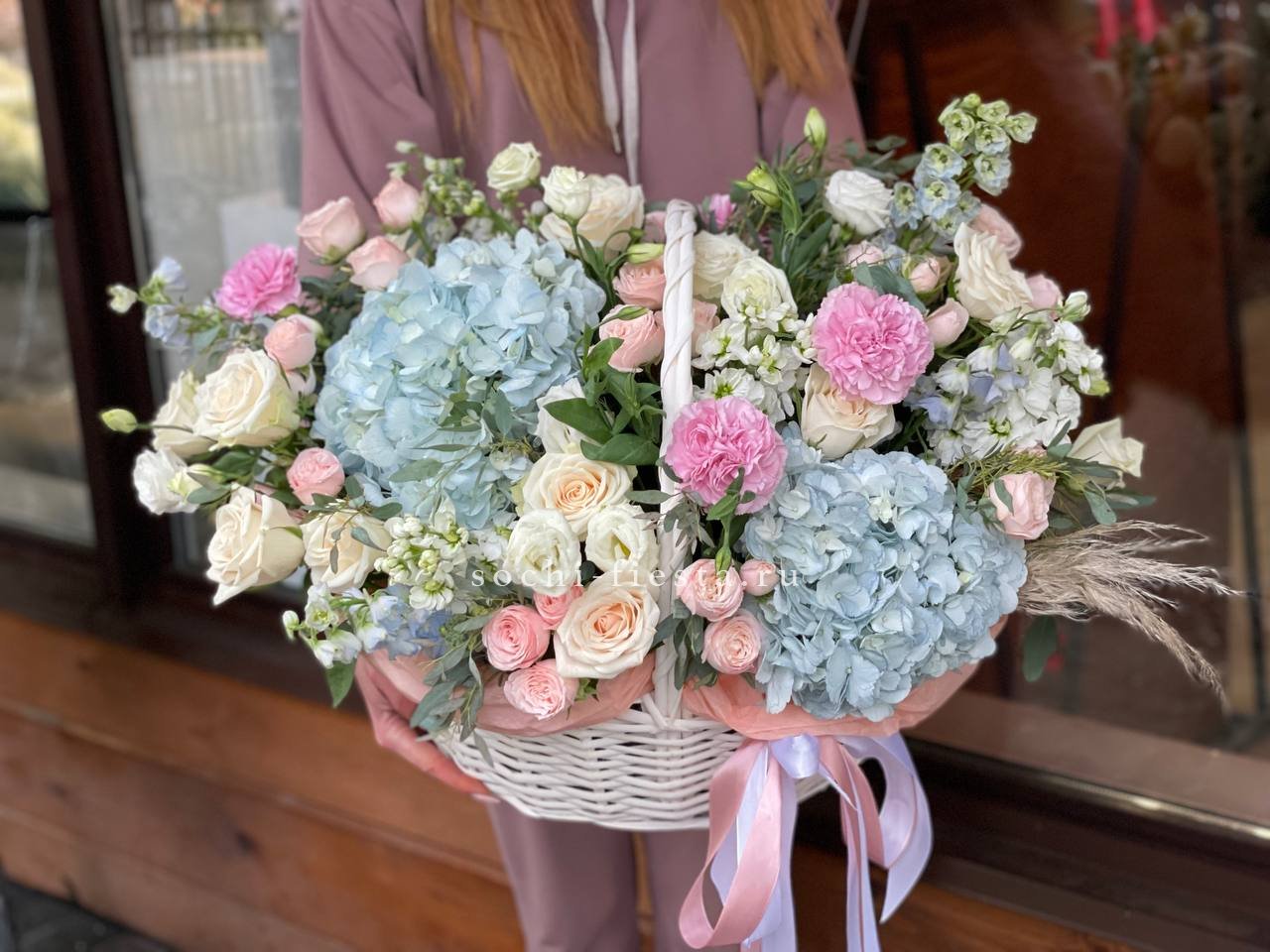 Сорок одна пионовидная роза в светлой корзине выстраивает объёмную композицию с мягкими переливами лилового и розового. Эвкалипт обрамляет густую россыпь бутонов.