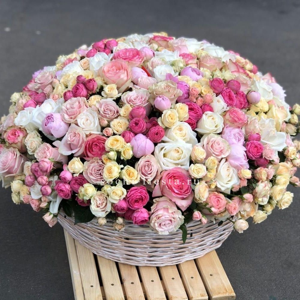 Двадцать пять французских роз с крупными бутонами и бархатистыми лепестками уложены в плетёную корзину. Натуральная основа придаёт композиции домашнее тепло и завершённость формы.