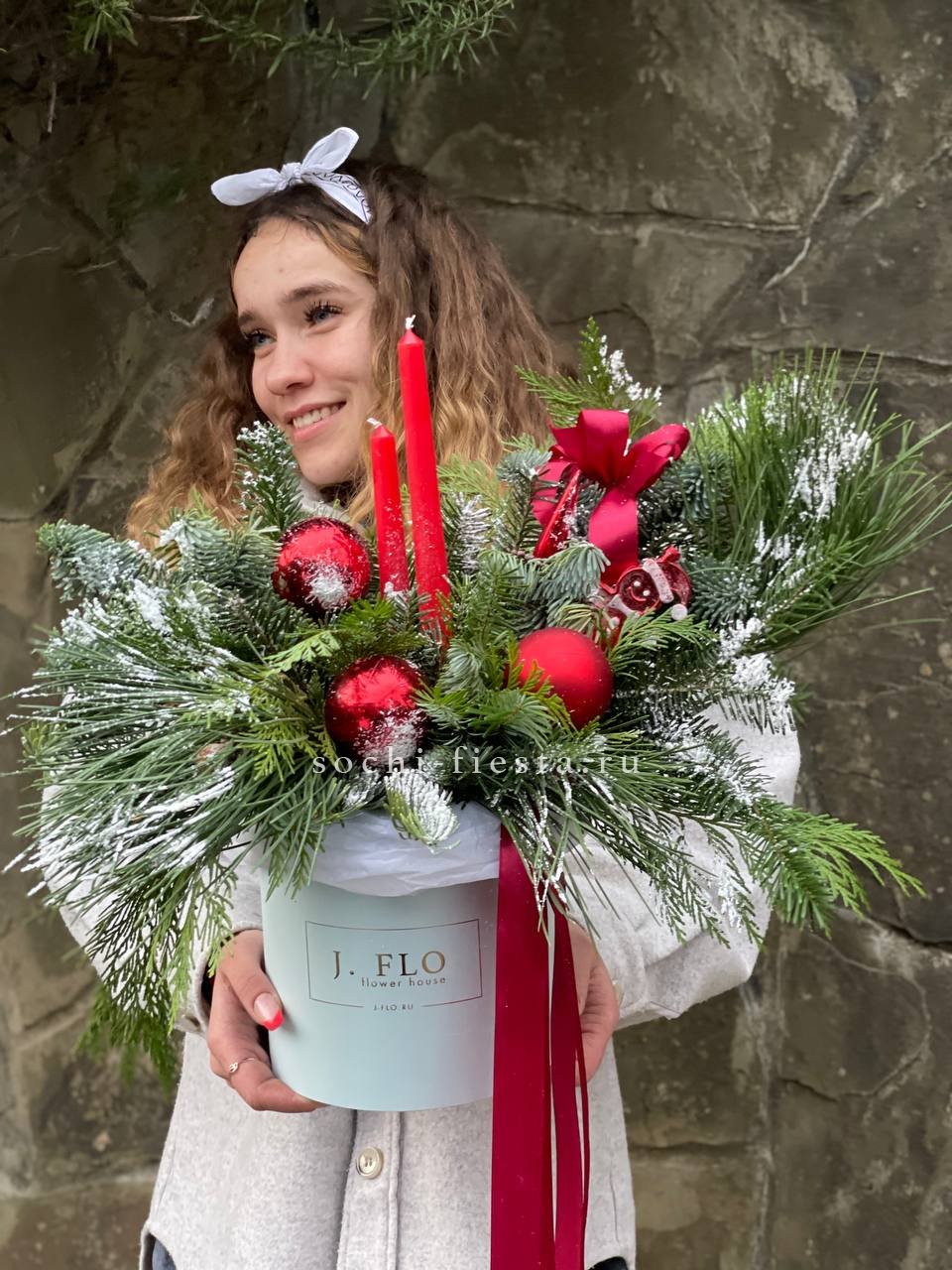 живая ель (датский нобилис), новогодние игрушки, свечи, декор, оазис, бокс D16см, ленты, тишью Готовая композиция может иметь незначительные внешние отличия от примера на фотографии.