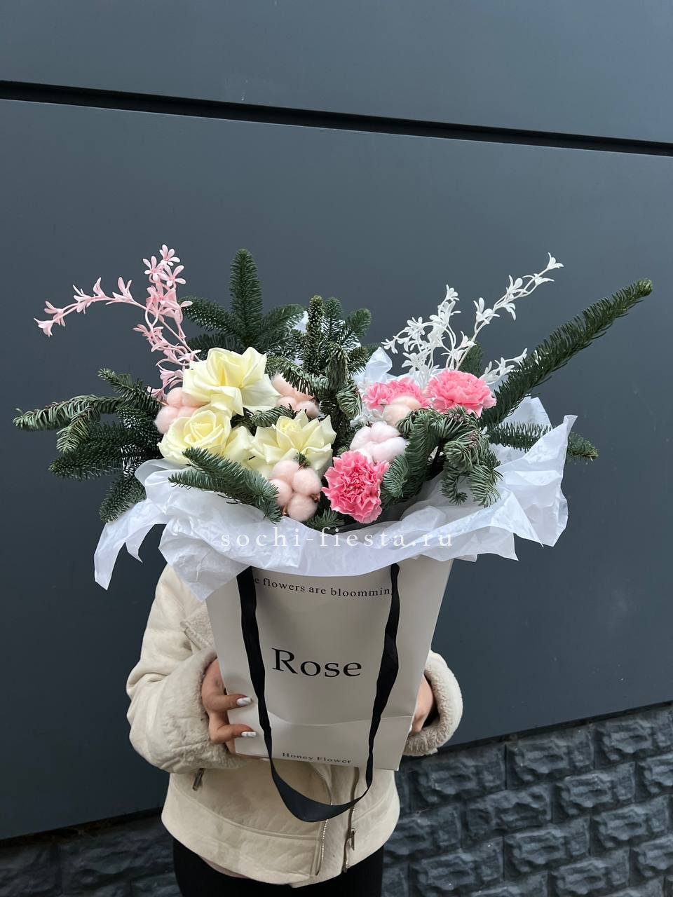 Белые розы и хлопок создают светлую основу, а нобилис вносит графичность. Диантус заполняет пространство мягкими переходами. Композиция выглядит объемно и сбалансировано.