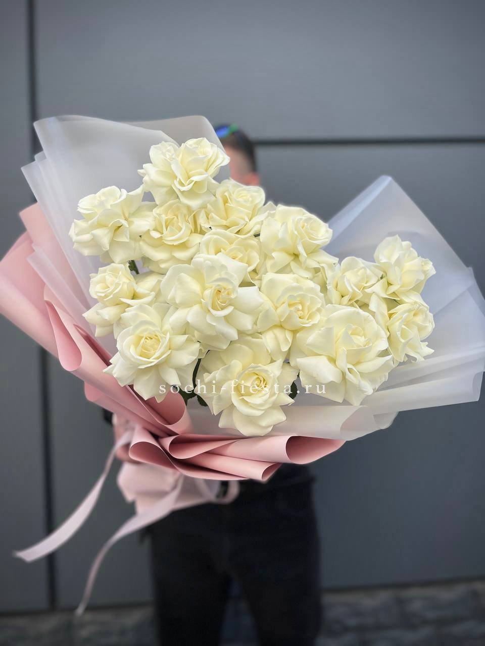 Пятьдесят один бутон выстраиваются в объёмную сферу с чёткой геометрией. Белые розы держат форму и создают ощутимое визуальное присутствие. Букет занимает пространство уверенно и спокойно.