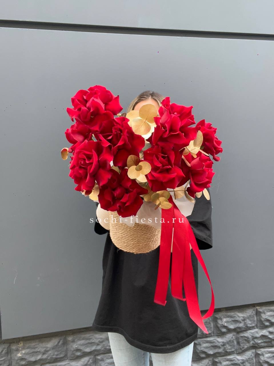 Двадцать три бутона выстроены в плотную округлую форму с чёткими линиями и выразительным силуэтом. Французские розы держат форму уверенно, а свежая зелень добавляет композиции графичности и завершённости.