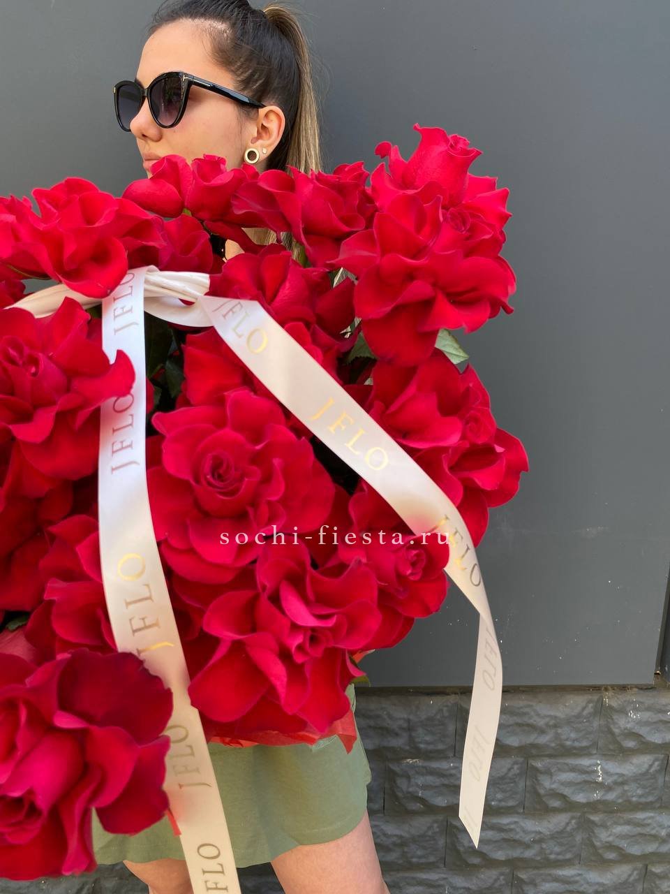 Девять бутонов насыщенного алого оттенка в лаконичной матовой обёртке. Каждый цветок раскрыт в полную силу, образуя плотную округлую форму с выразительным силуэтом.