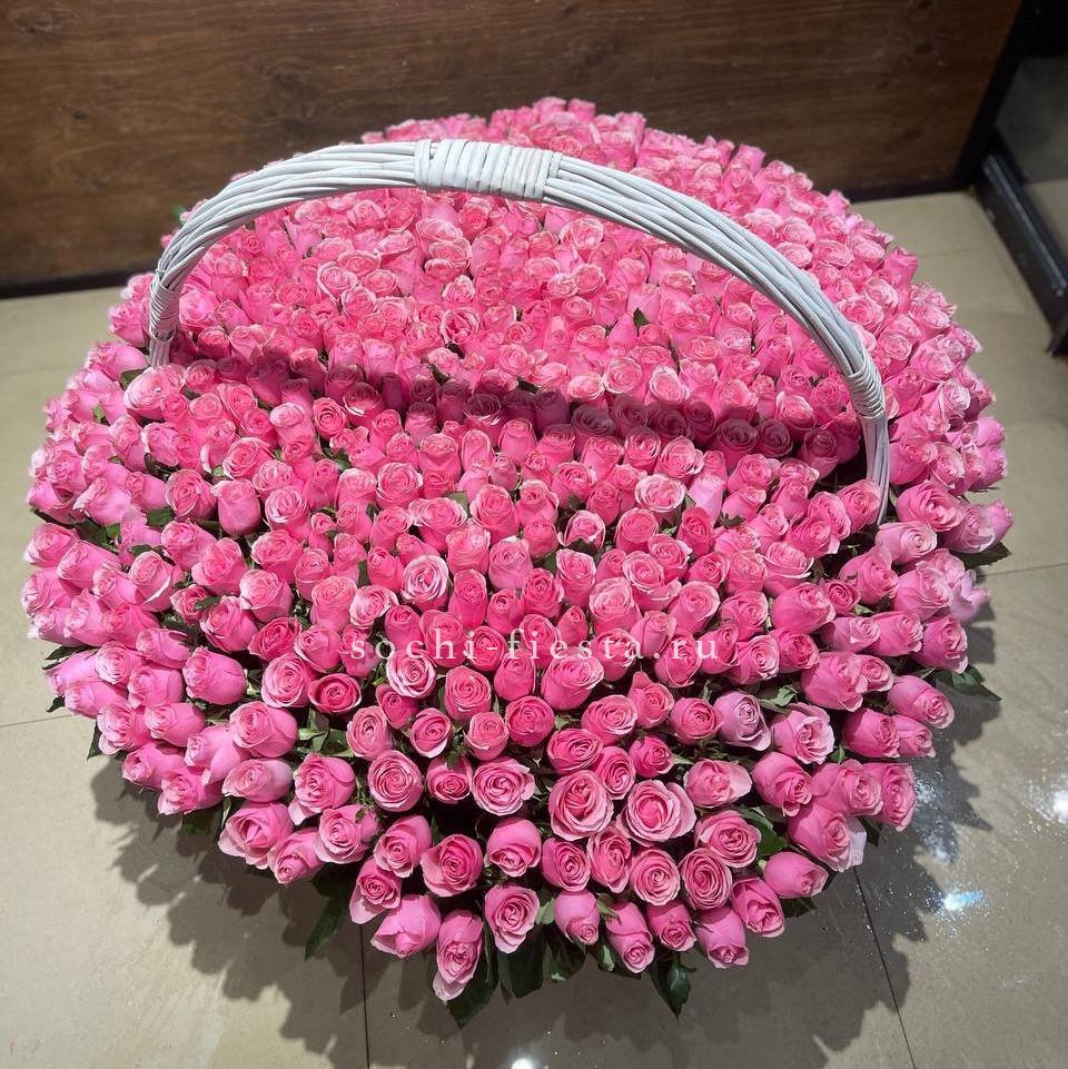 Пятьсот один бутон в корзине — это объем, который заполняет собой все вокруг. Розовый цвет разворачивается волнами, создавая почти скульптурное присутствие в интерьере.