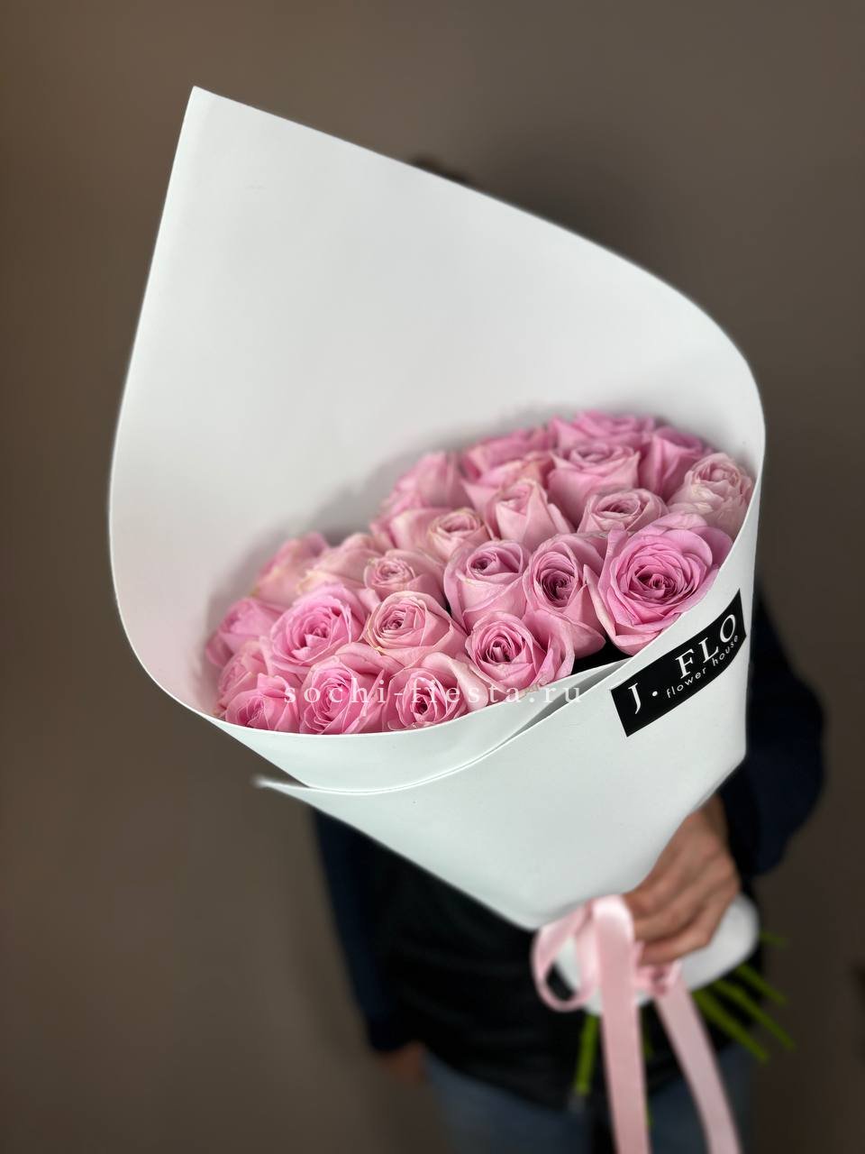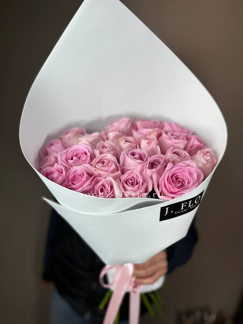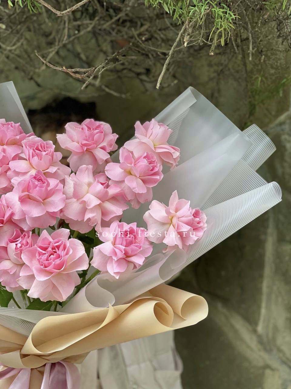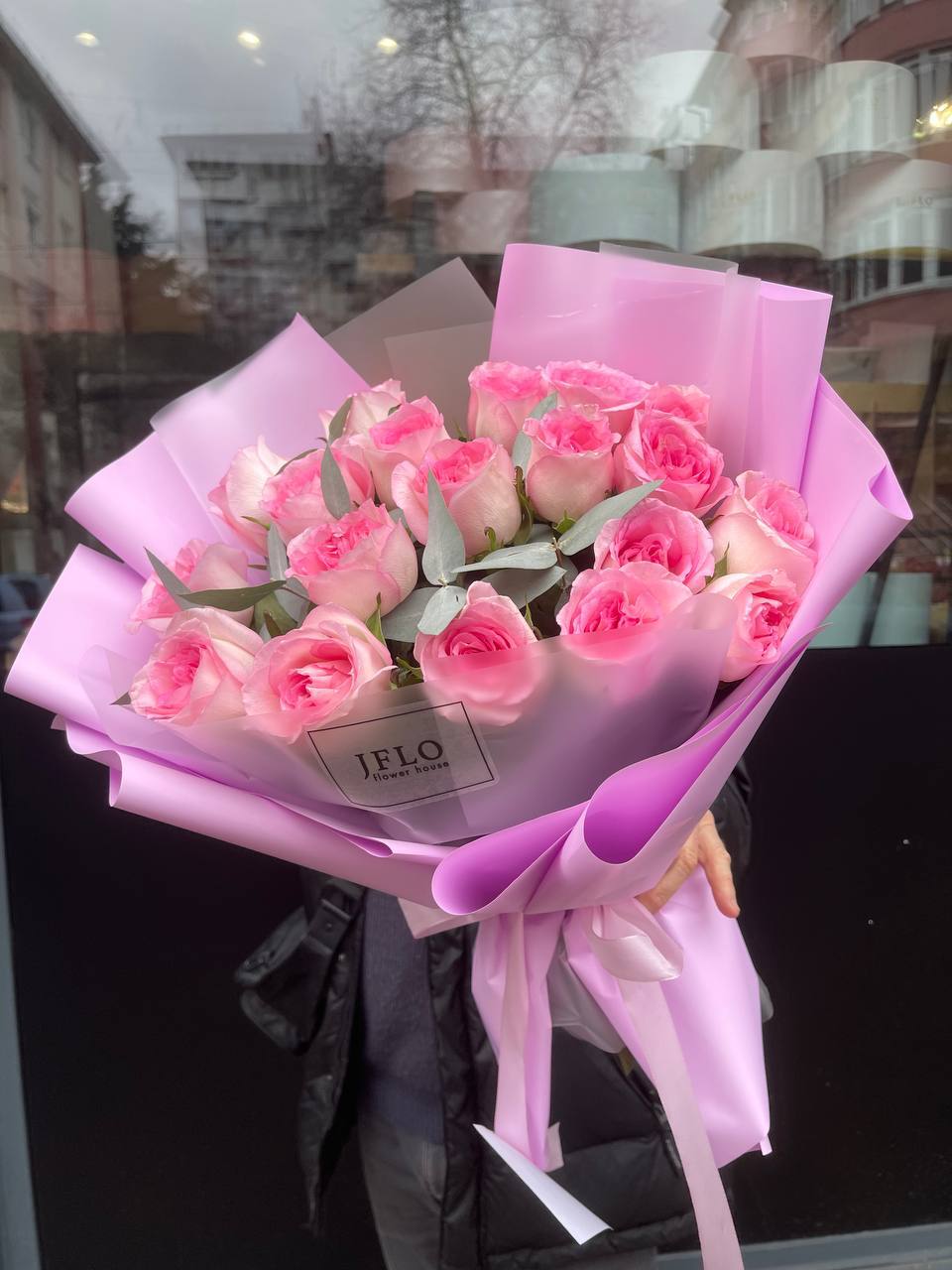 Пятнадцать французских роз Pink Dream с характерно вывернутыми лепестками. Фактура бутонов открывает глубину цвета и добавляет объем всей композиции.