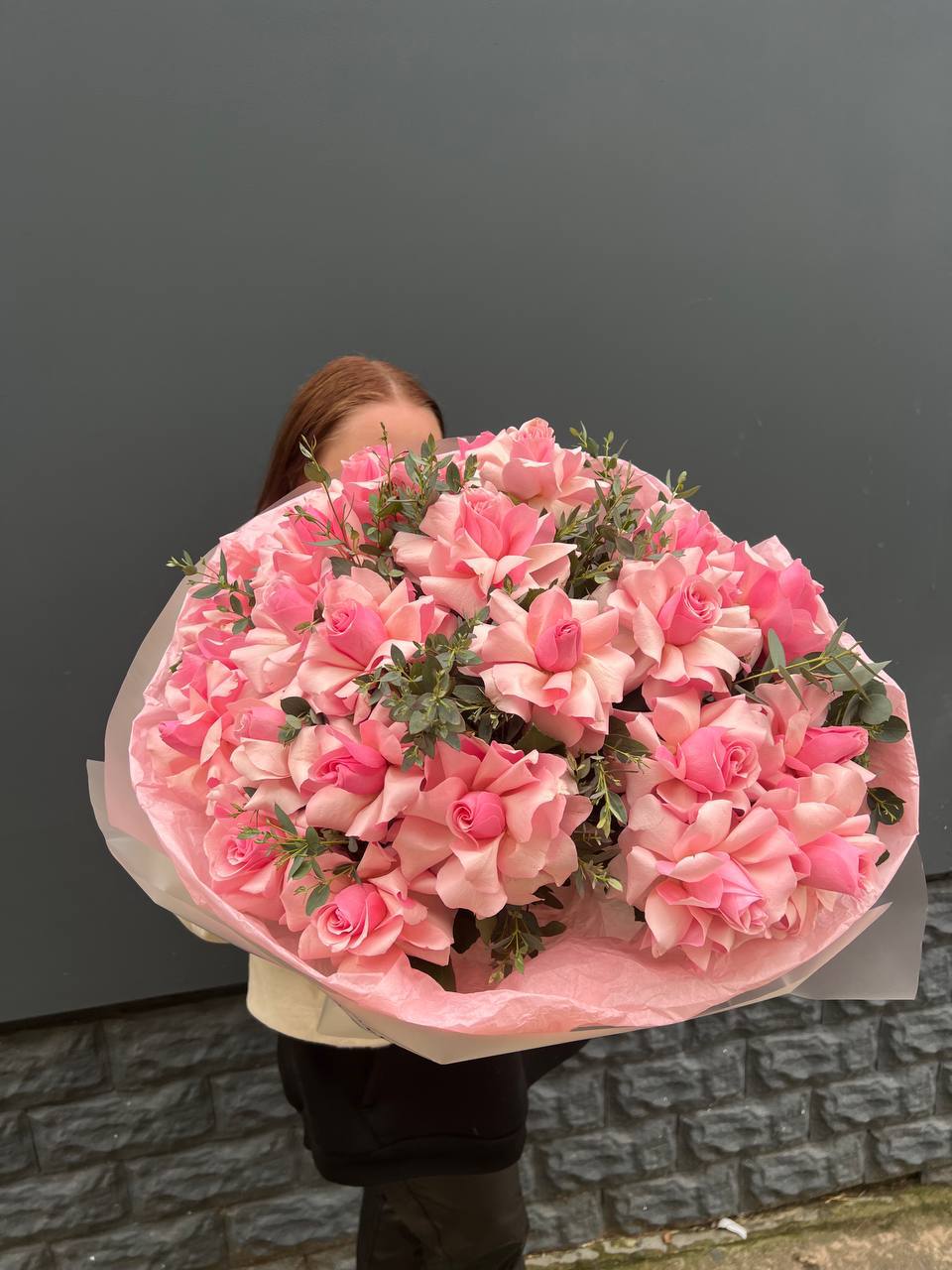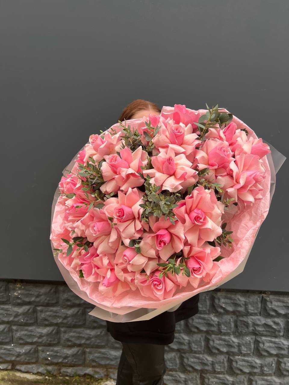 Розовые бутоны собраны в воздушную композицию с комбинированной упаковкой. Тишью добавляет фактурности, а количество цветов можно выбрать под настроение момента и масштаб события.