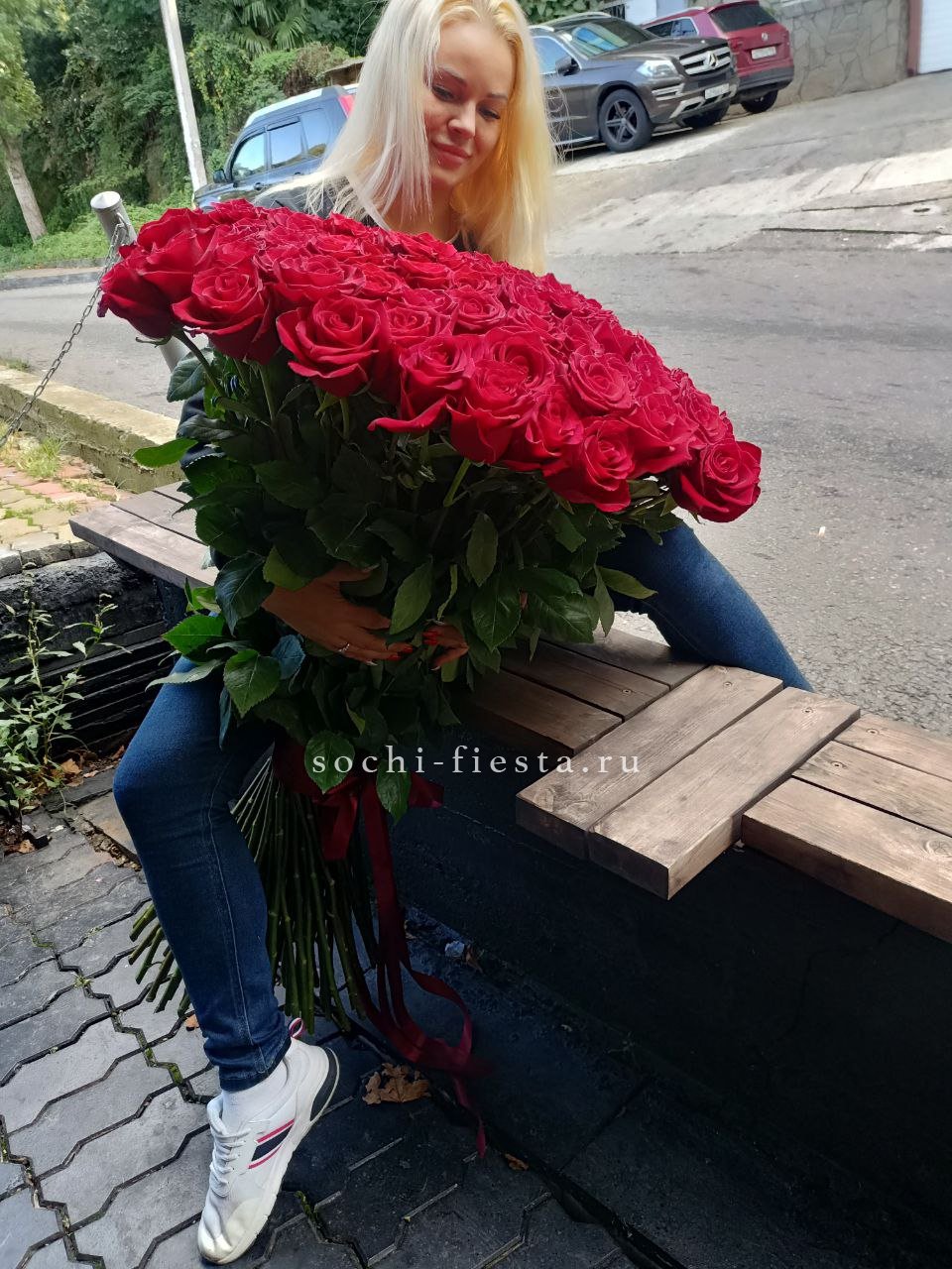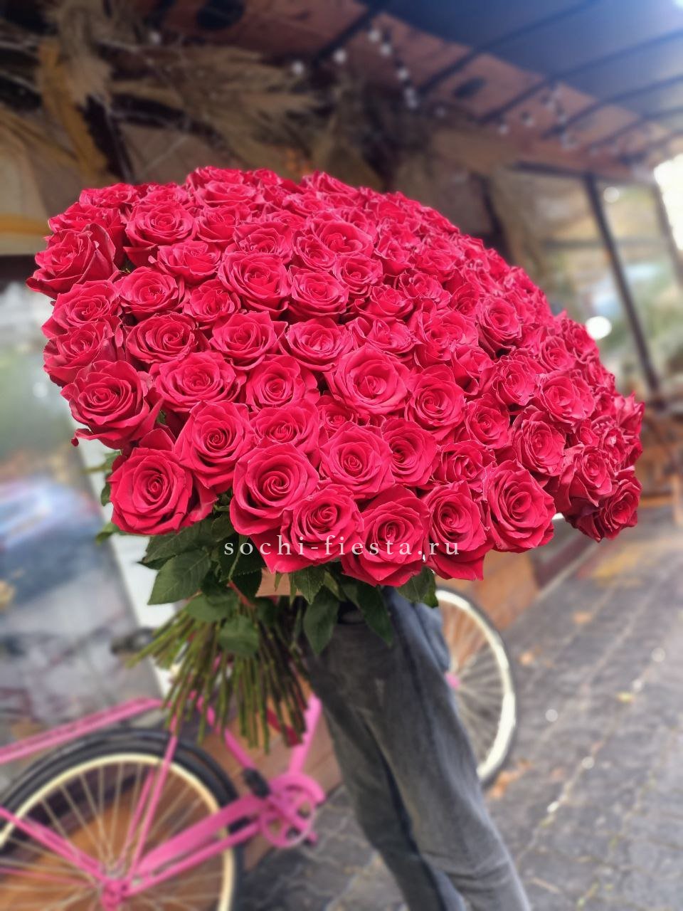 Сто одна красная роза собрана в монохромный букет насыщенного алого оттенка. Высокие стебли создают впечатляющий объем и заполняют пространство уверенным присутствием.