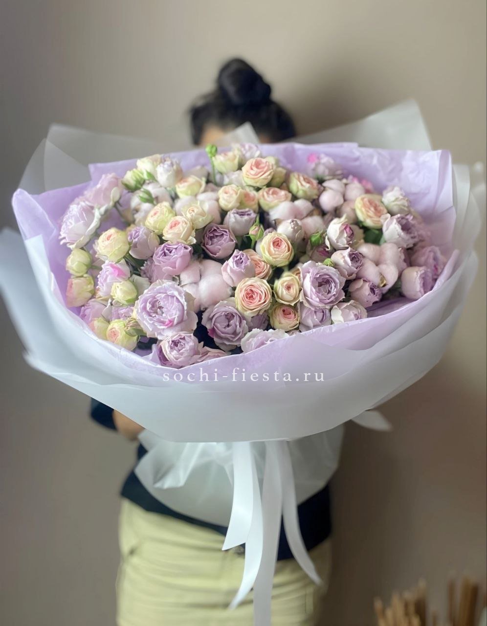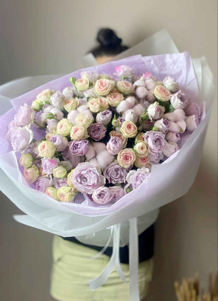 25 пионовидные кустовые розы,  хлопок, лента, дизайнерская упаковка.