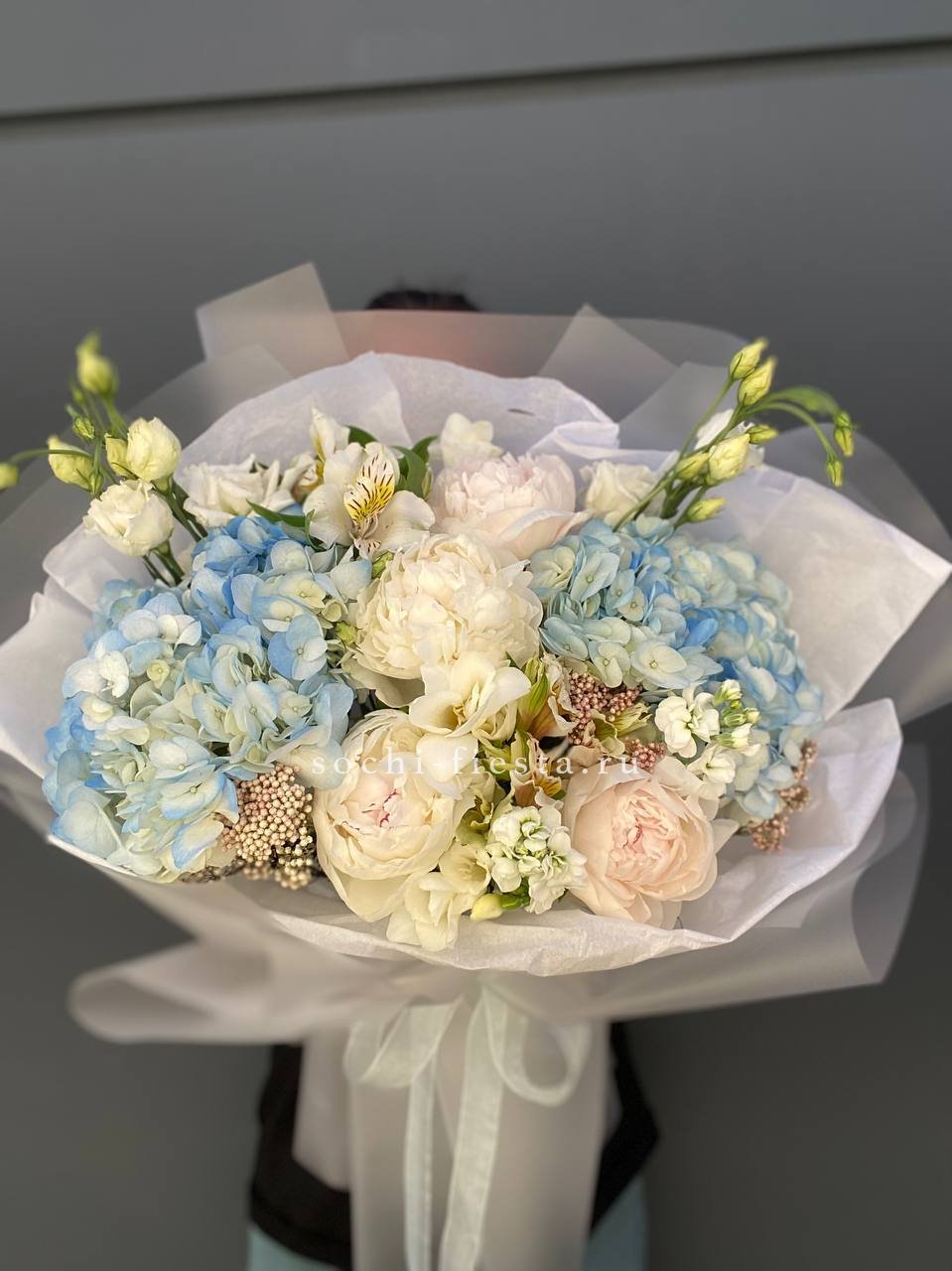 Светлая композиция собрана из пионов, гортензий и эустомы в мягкой белоснежной гамме. Воздушная форма с лёгкими переходами между соцветиями создаёт ощущение морозной свежести.