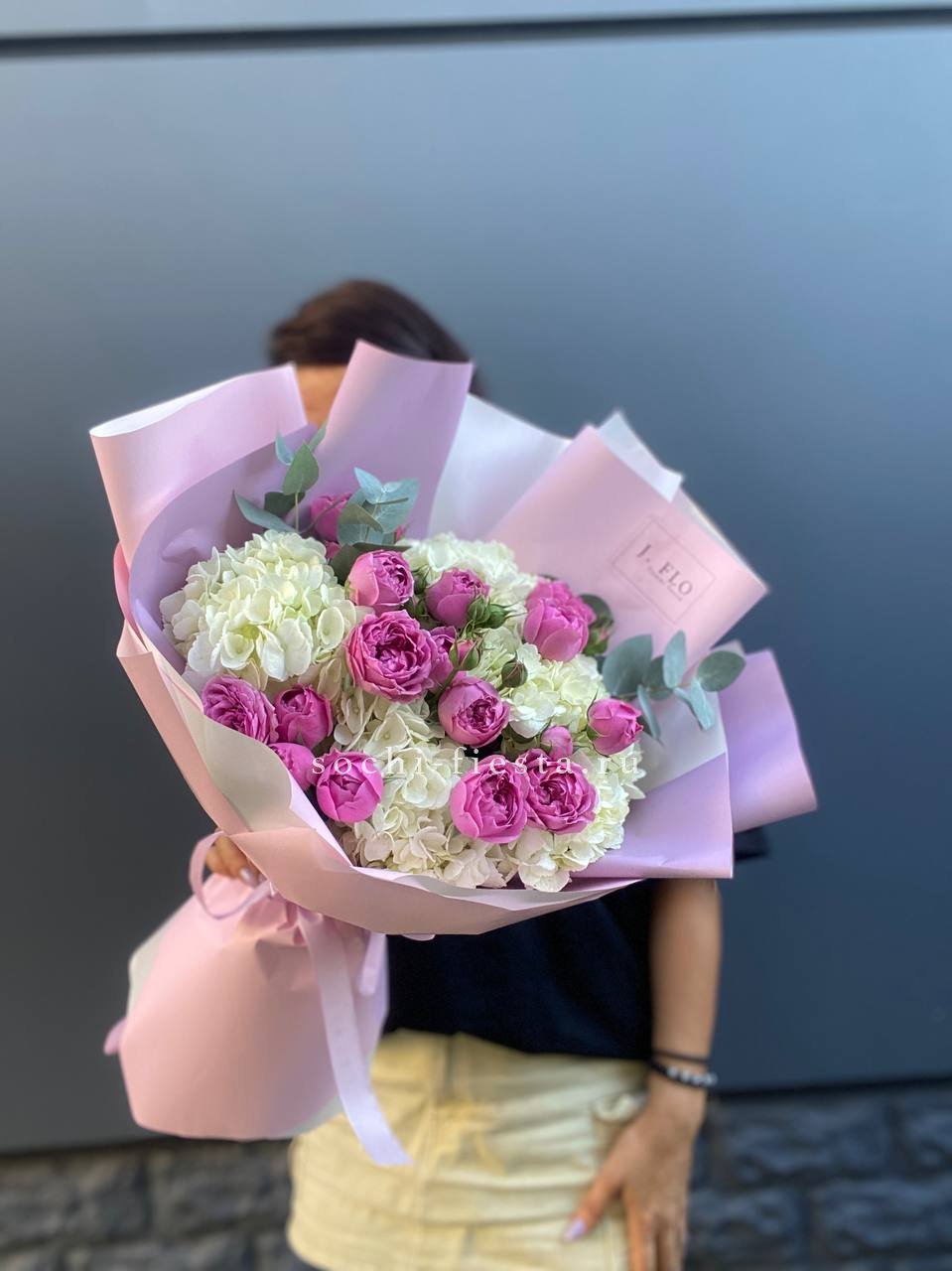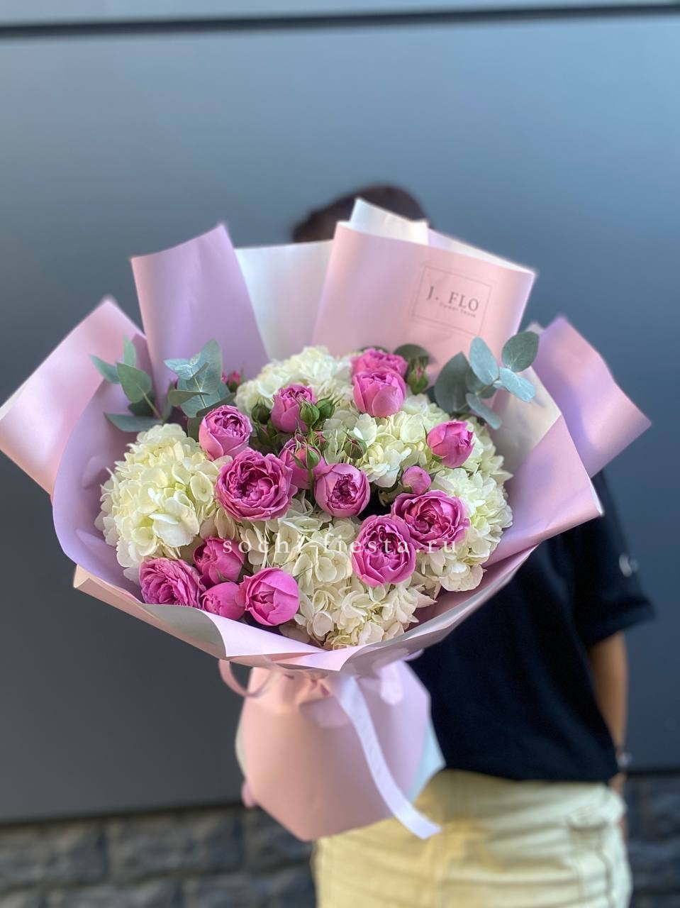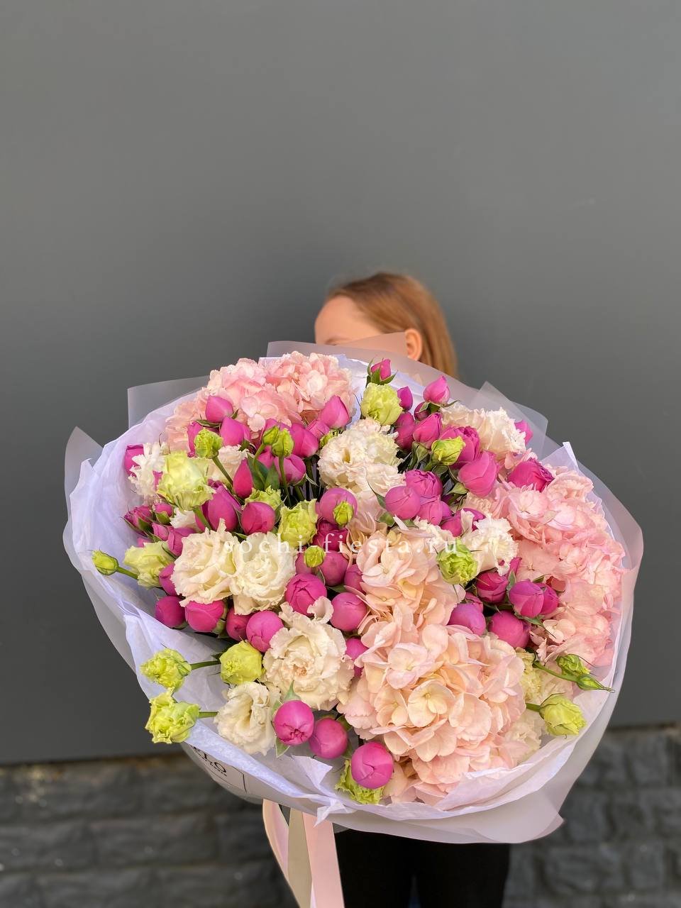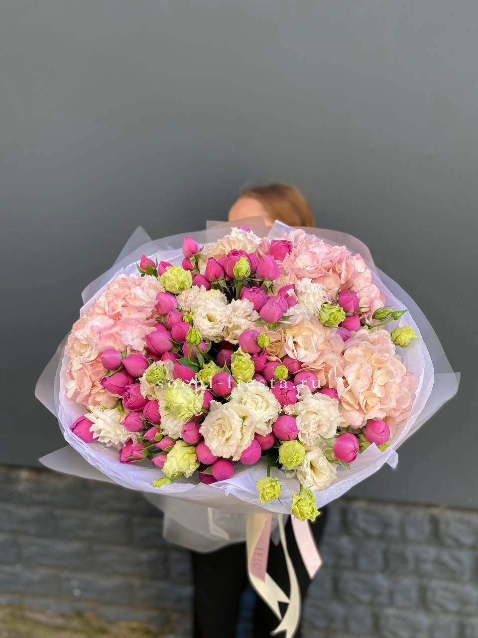 Плотная сборка с пышными соцветиями гортензии и яркими герберами создает объемный силуэт. Маттиола и лимониум добавляют воздушности по краям, а диантусы заполняют центр мягкими переходами.