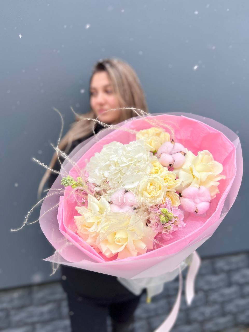 Белые французские розы переплетаются с пушистыми соцветиями маттиолы и хлопка. Гортензия и пионовидные бутоны создают объём, а ковыль вносит лёгкую небрежность в общий ритм.