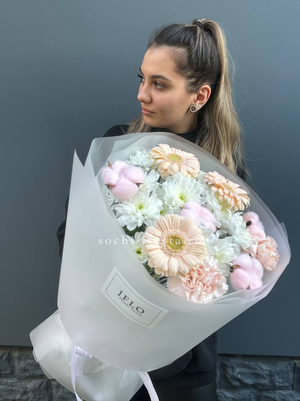 герберы, хризантемы, статица (аналог), диантусы, хлопок, упаковка.