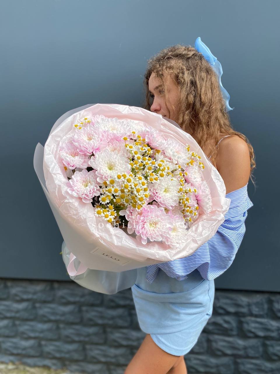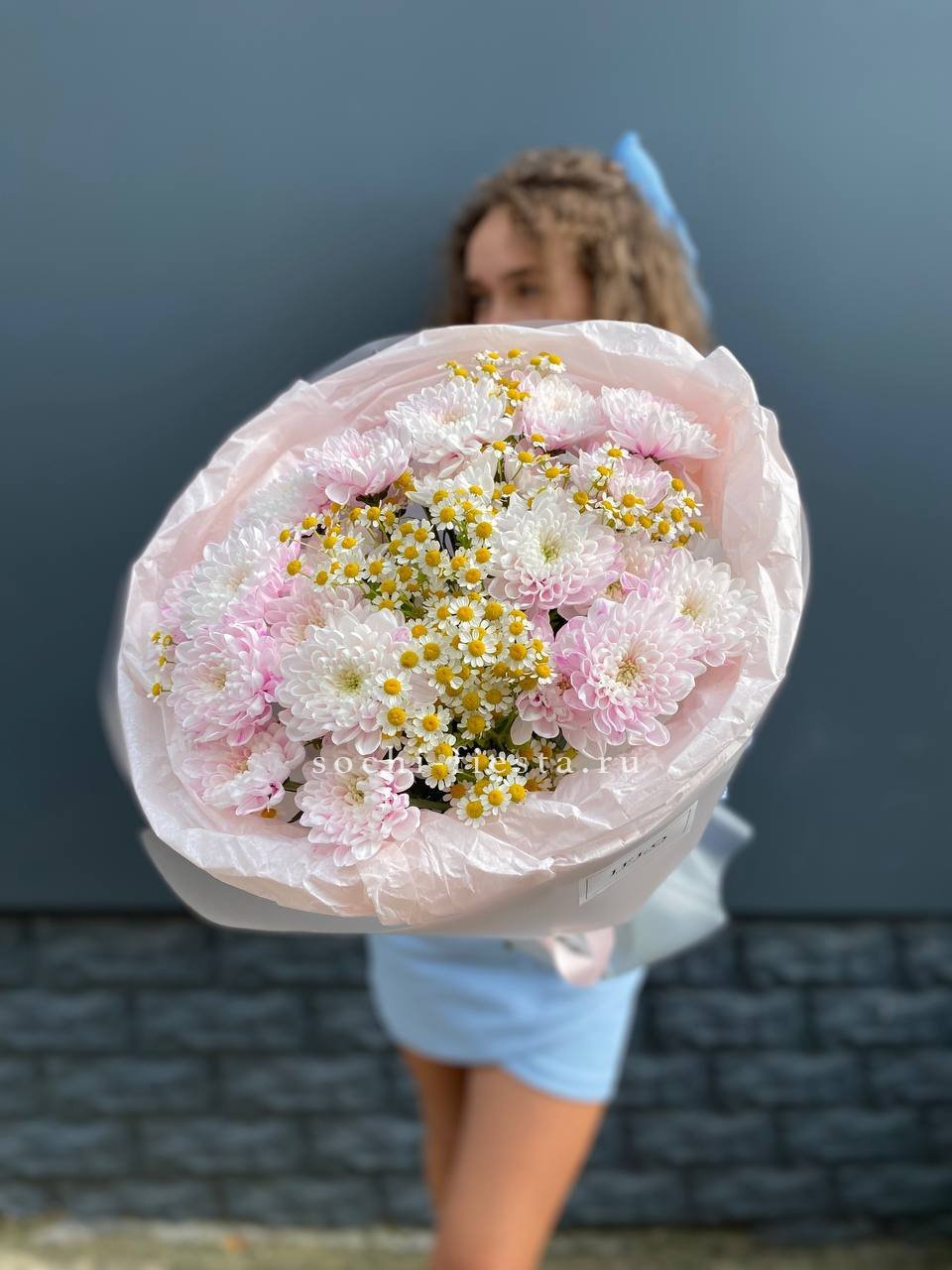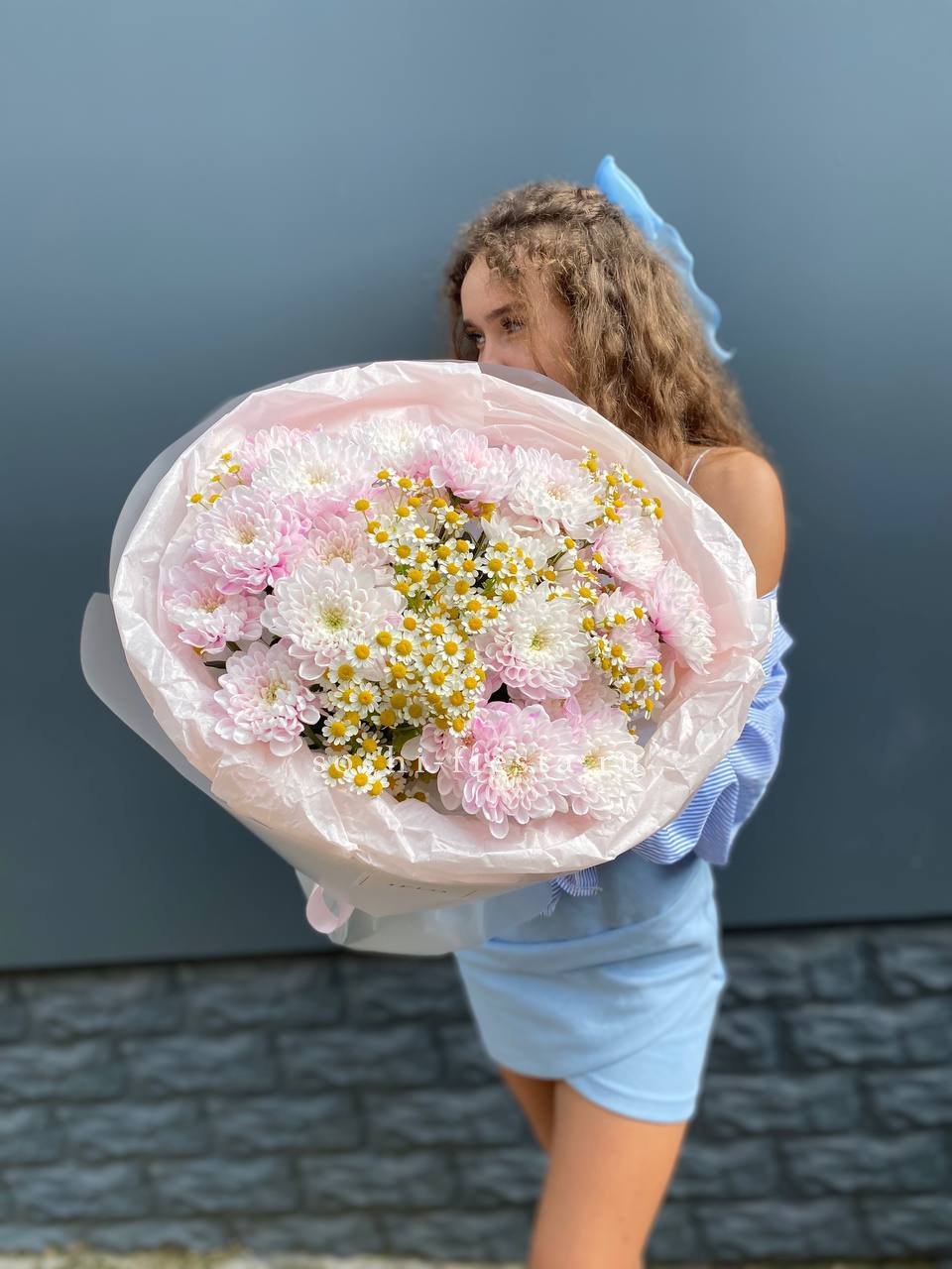 ромашки, кустовые хризантемы, лента и дизайнерская пленка.