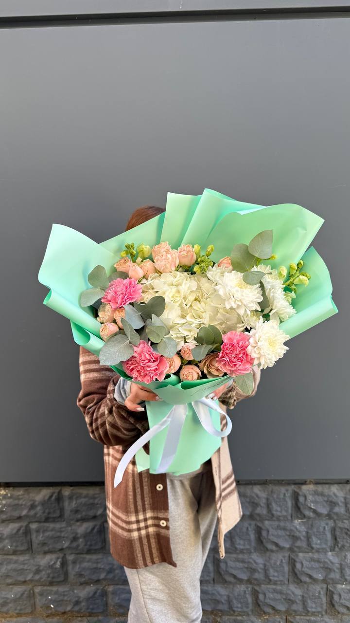 Этот пышный авторский букет в мятно-пастельных тонах — само воплощение весенней свежести и легкости.