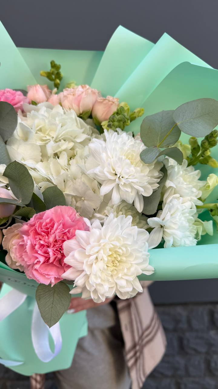 гортензия, бомбастик, диантусы, эвкалипт, антиринум, хризантема, пленка.