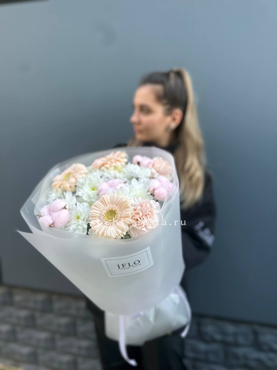 герберы, хлопок, эустома, хризантемы,  авторское оформление.