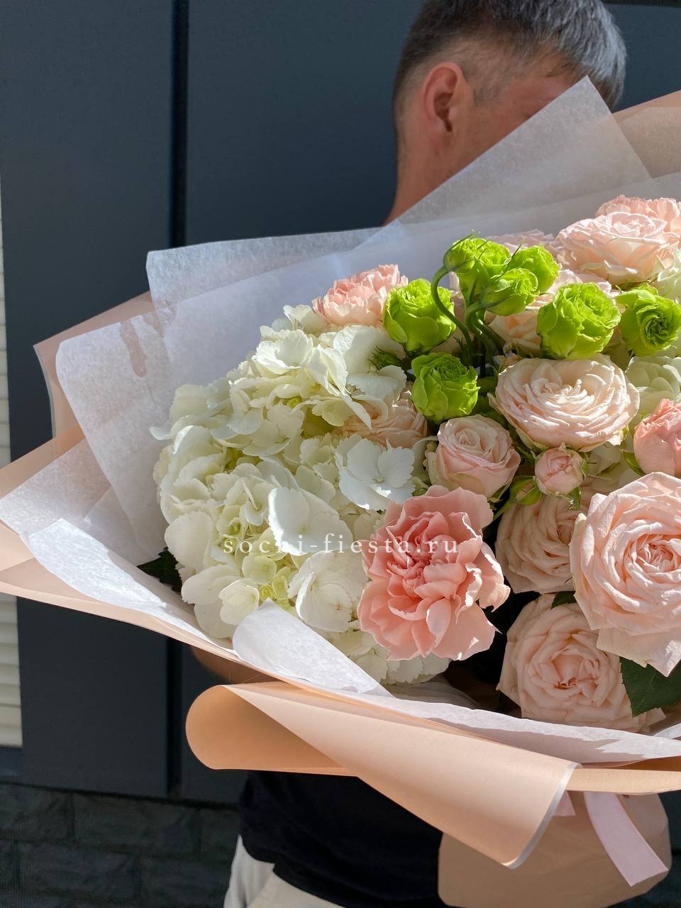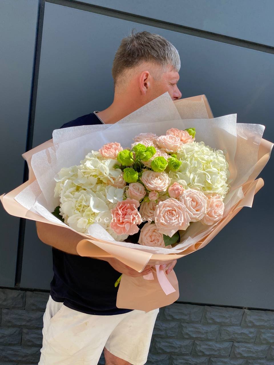Воздушная композиция с крупными соцветиями гортензии и пышными розами создает ощущение легкости и объема. Эвкалипт добавляет свежести, а бомбастик расставляет яркие акценты между бутонами.