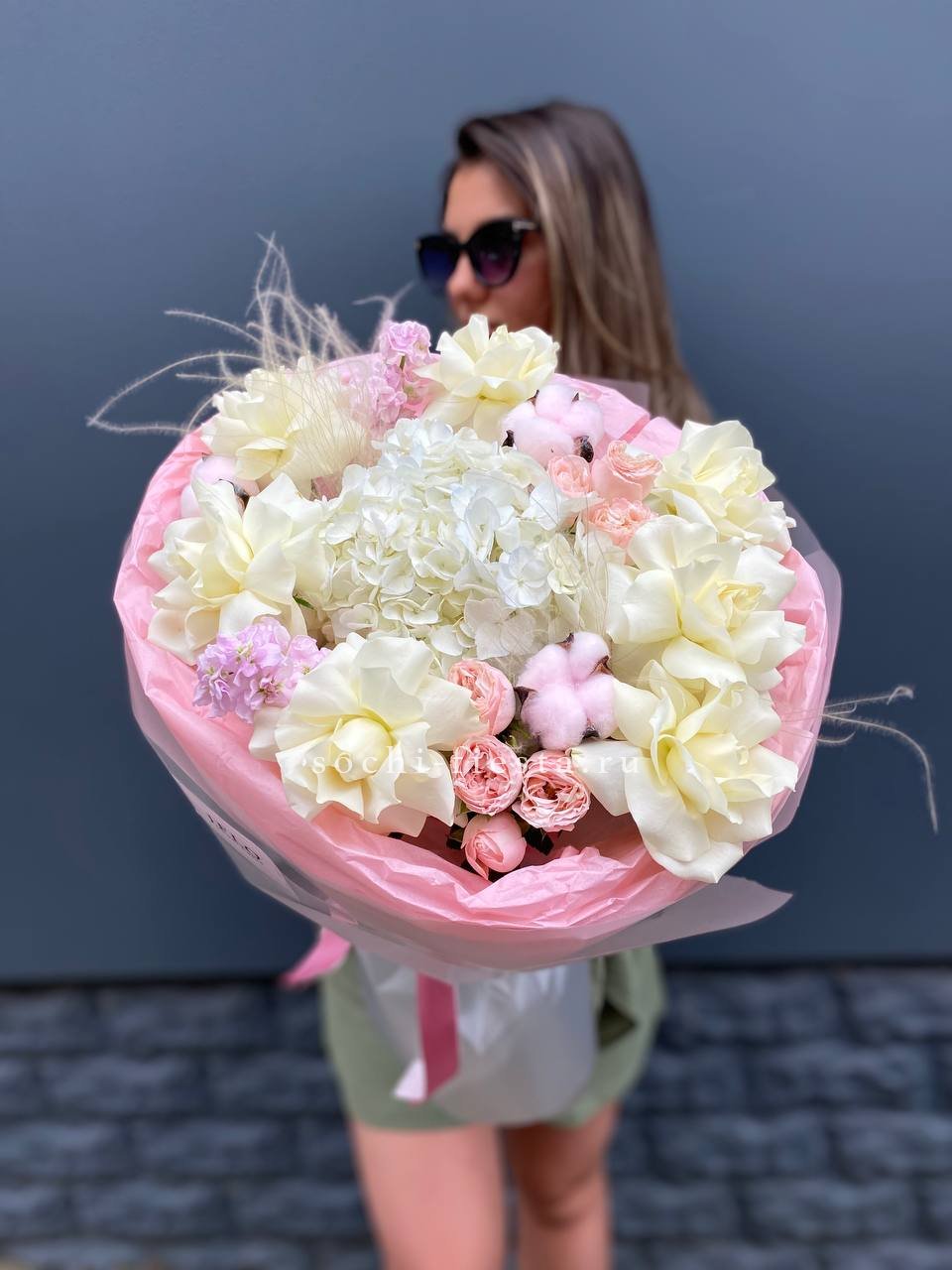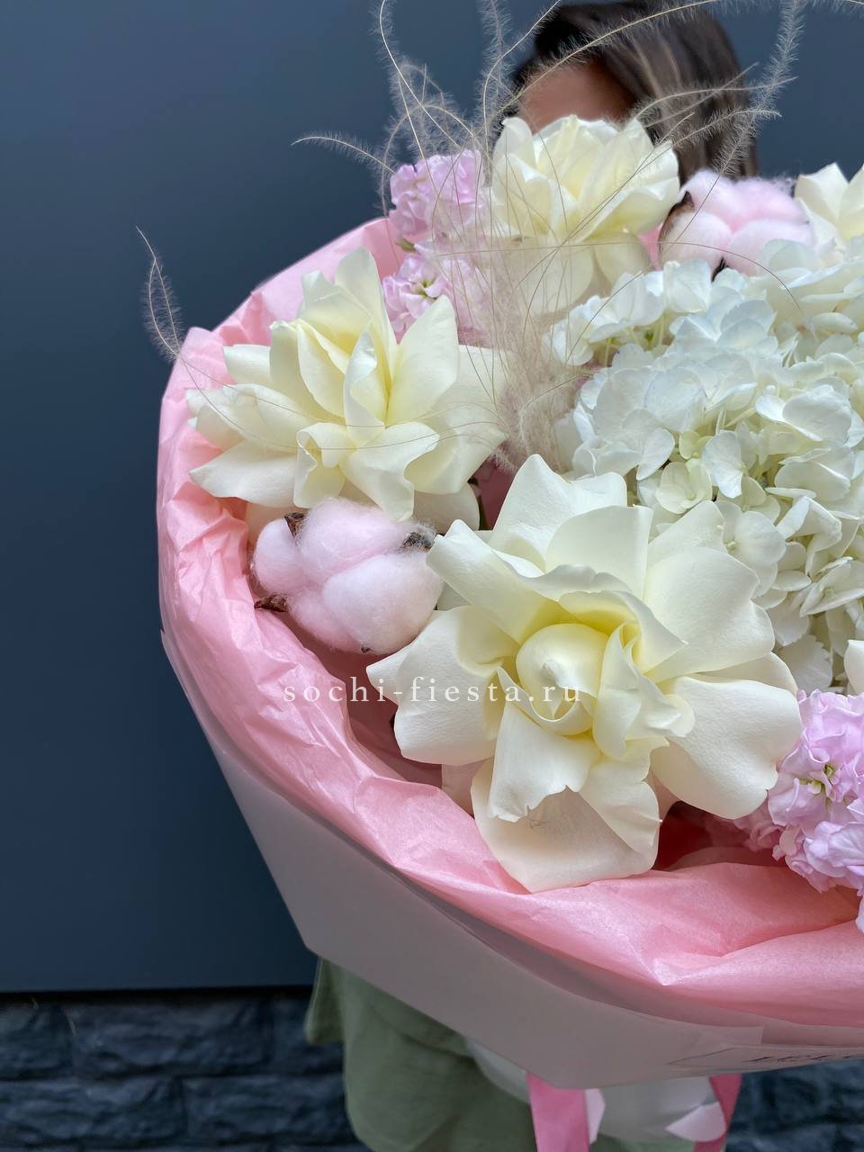 В центре внимания — фактуры и цвет! Современный, стильный букет, который сочетает бархатистые бутоны роз и мягкий хлопок. Это не просто цветы, а целая цветочная композиция для тех, кто ценит красоту в деталях. Отличный повод порадовать себя или близких!