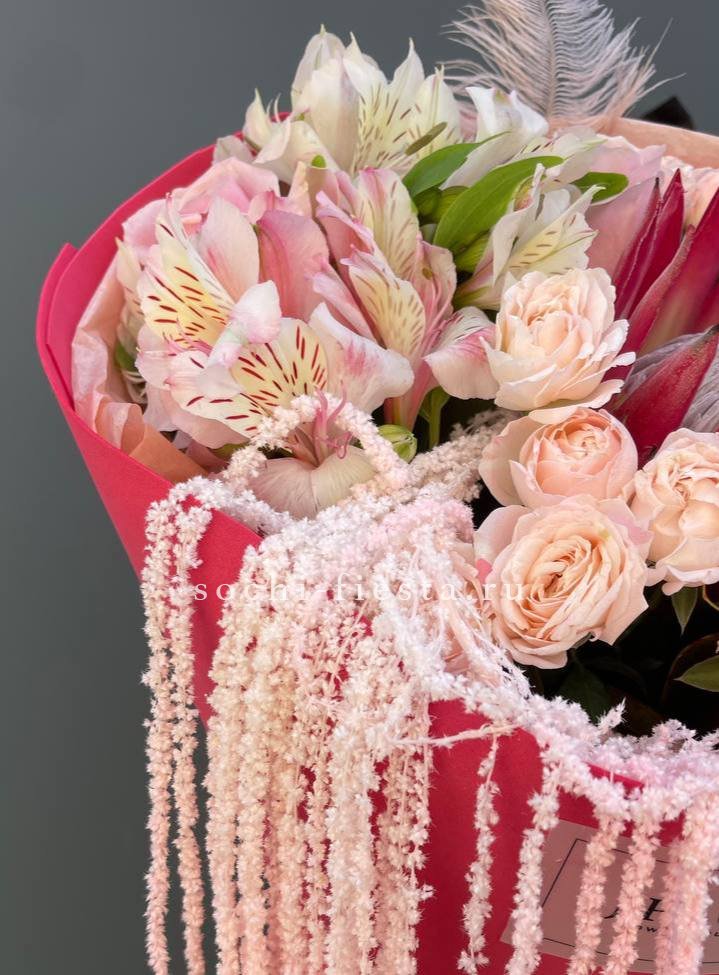 Пышные пионы окружены воздушными эустомами и миниатюрными кустовыми розами, а экзотичная протея добавляет композиции выразительный акцент. Бархатистые лепестки чередуются с полураскрытыми бутонами, создавая объёмную фактуру и глубину букета.