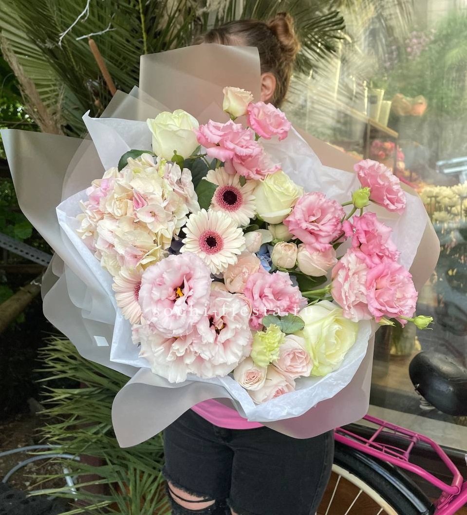 Светло-розовая палитра раскрывается от пудровых роз до свежих гербер. Бруния и аспарагус добавляют фактурные детали, а гортензия мягко завершает цветовую гамму.