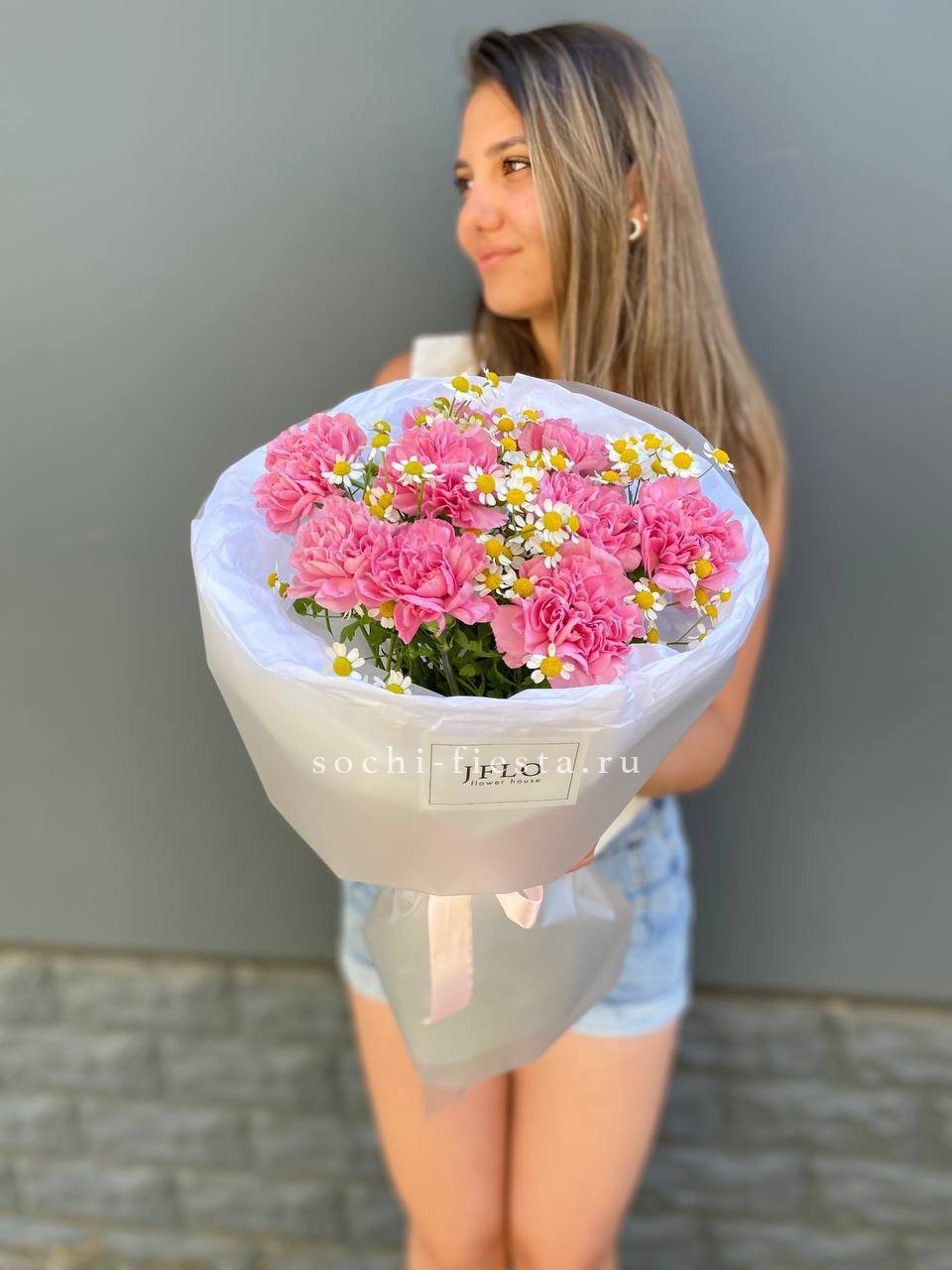 Два отдельных букета в одной композиции создают свободную асимметрию. Белые ромашки с открытыми серединками и пышные диантусы собраны так, что каждая часть читается самостоятельно, но вместе они держат общий ритм и объем.