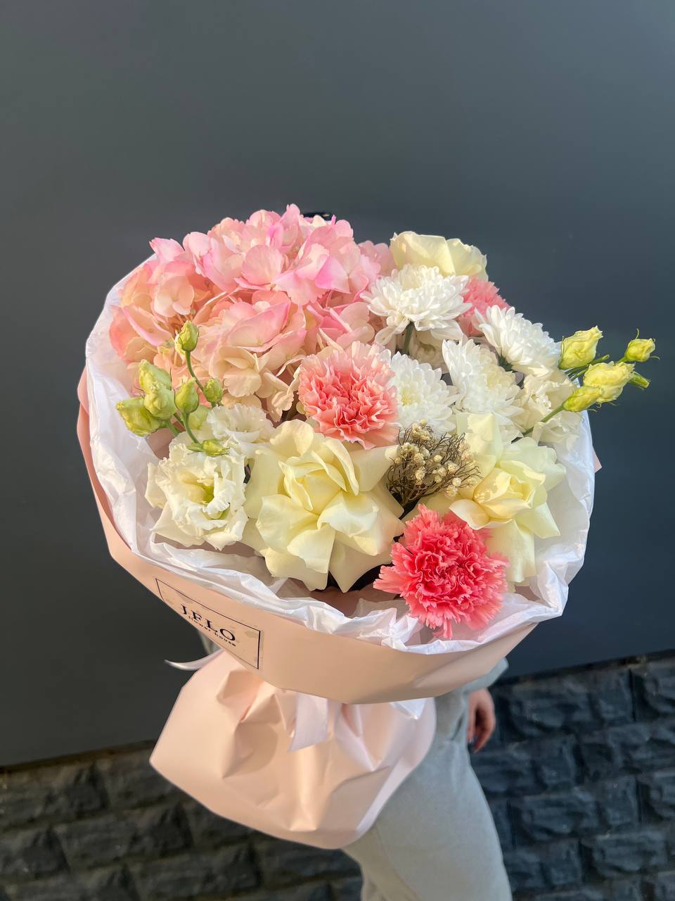 гортензия, гвоздика, статица (или аналог), роза, эустома, дизайнерская пленка, лента.