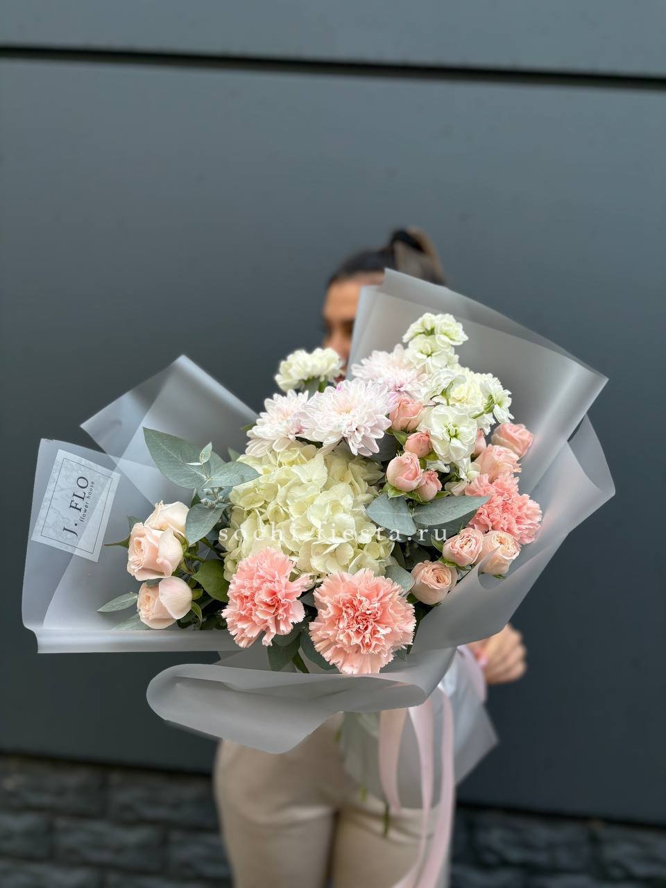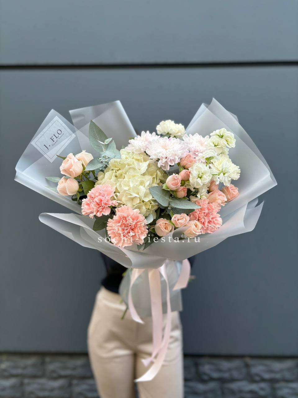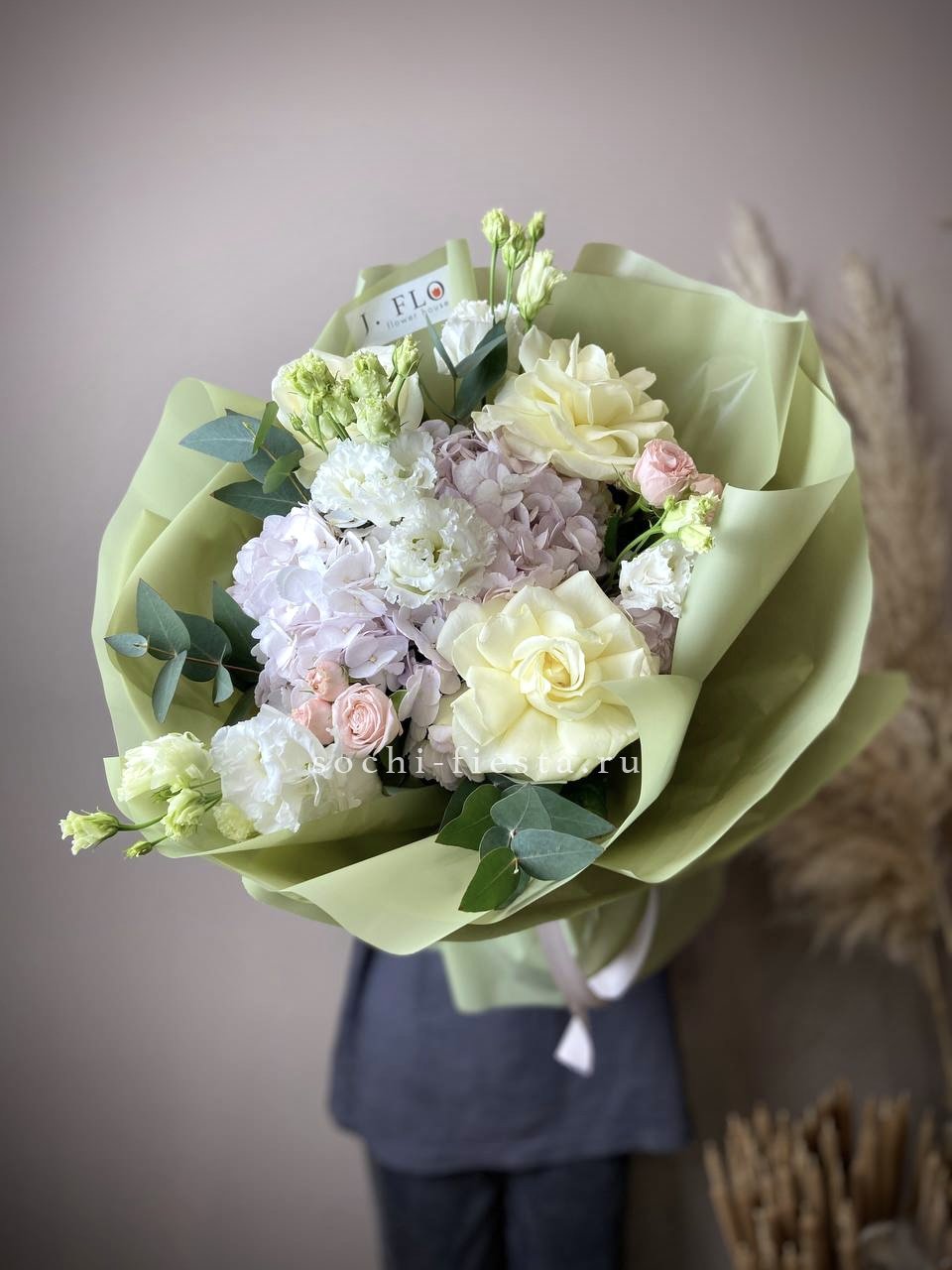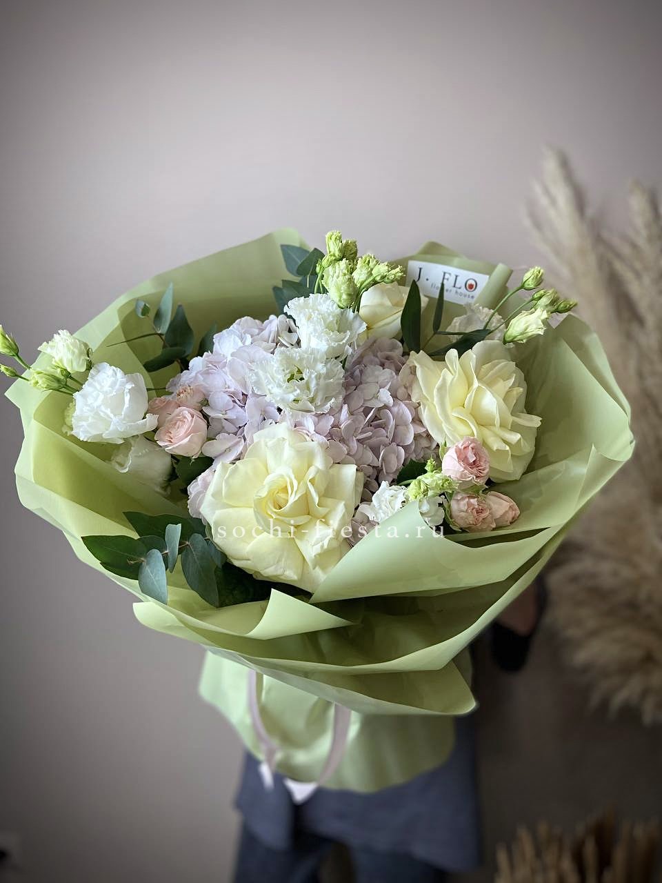гортензия, пионовидные розы, пампасная трава (стифа), лента, дизайнерская упаковка.