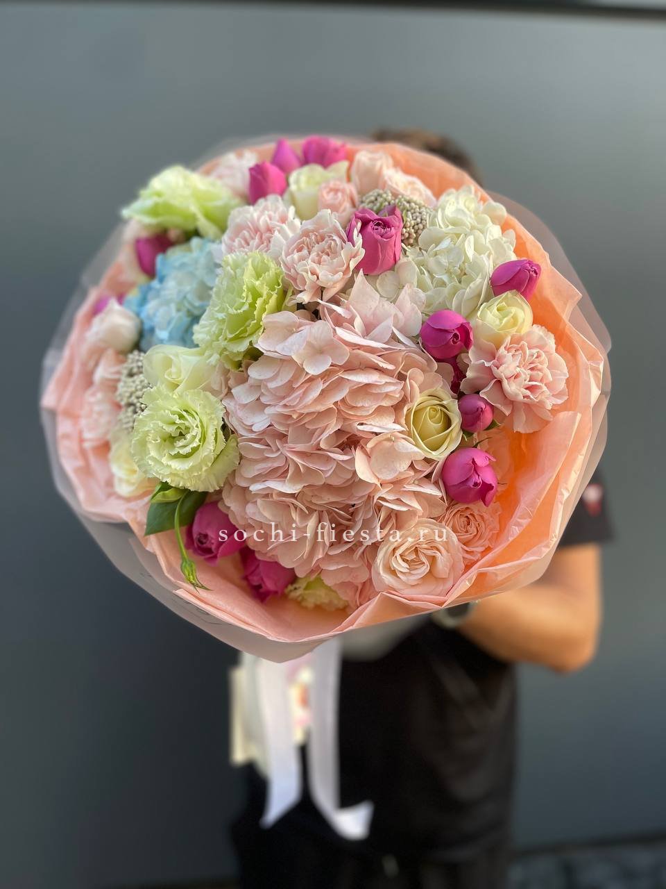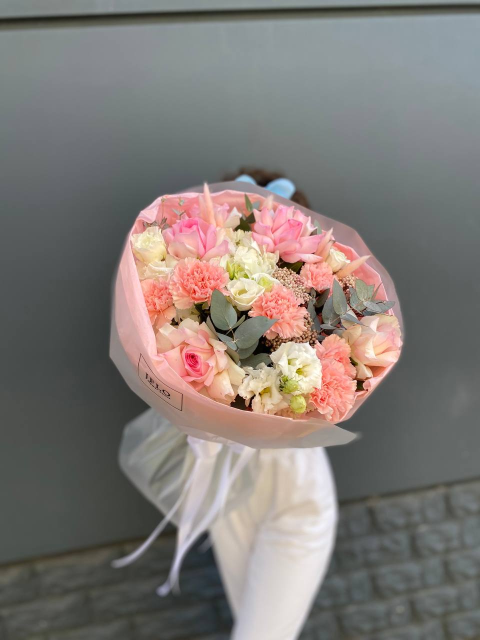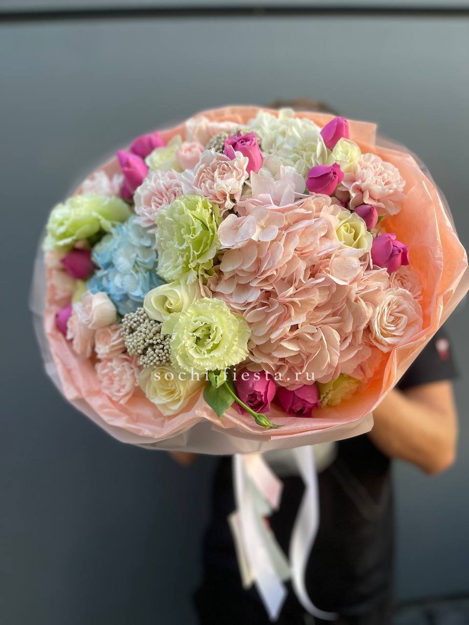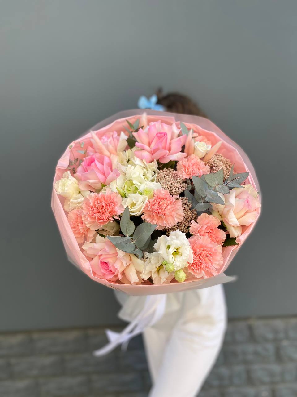 гортензия, гербера, диантус, эустома, свит ревиваль, кустовая роза, эвкалипт, лента, корейская пленка.