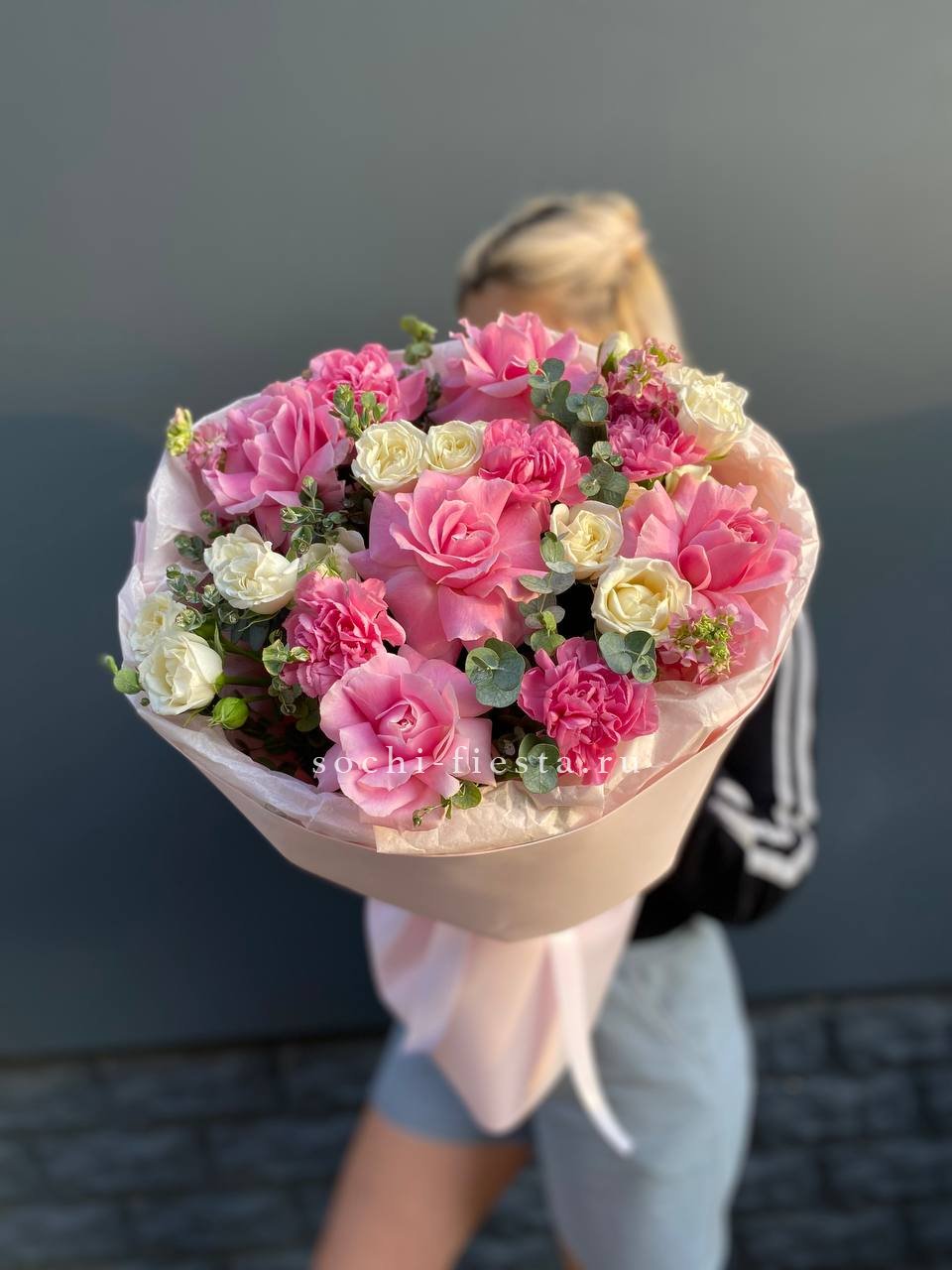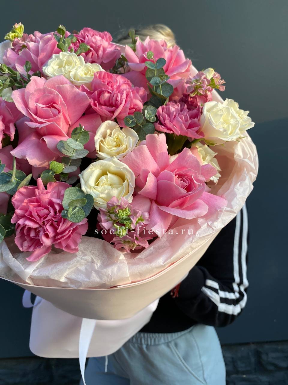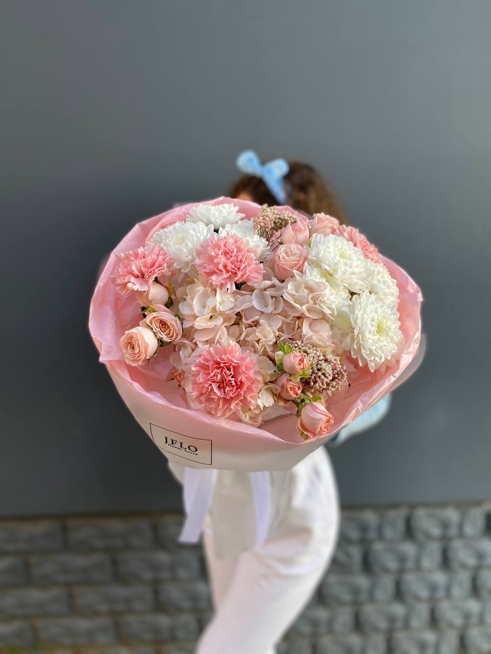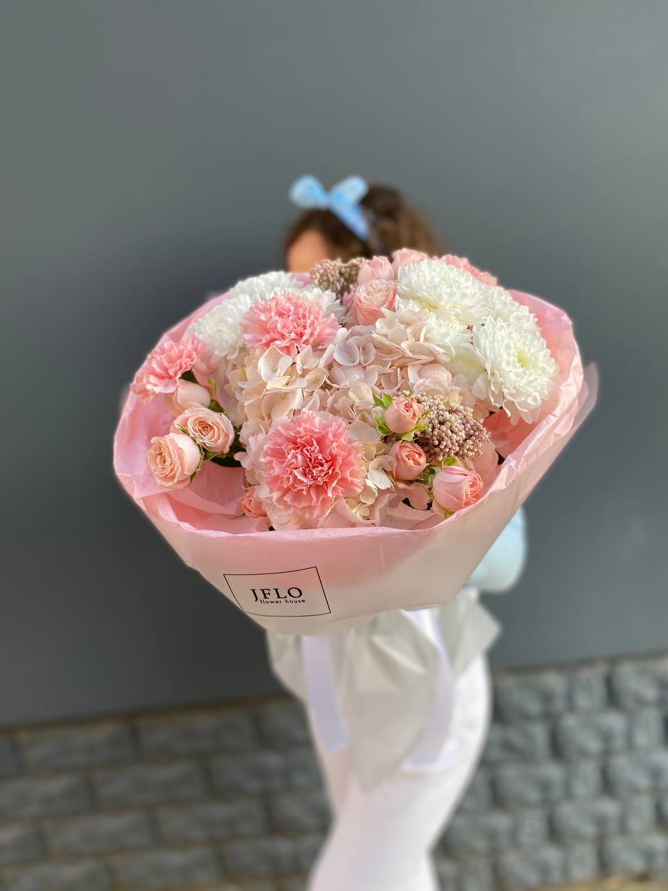 гортензия, гербера, диантус, эустома, свит ревиваль, кустовая роза, эвкалипт, лента, корейская пленка.